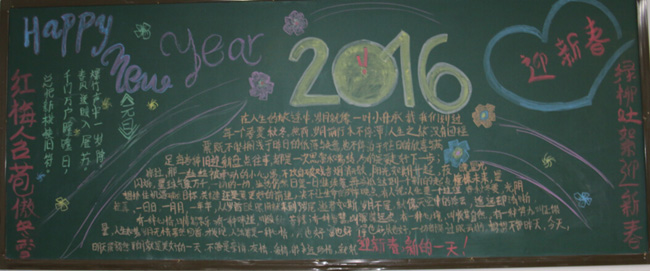 光影流年,翰墨图画,踏着2015年坚实的脚步,迎来万象更新的2016。为了让同学们在新的一年有新的气象,校学生处(团委)举办了“迎新年”主题板报评比活动。各班板报能做到主题突出,又丰富多彩。同学们充分发挥自主创新能力,大多数黑板报办得别出心裁。板报内容充实,版面设计合理,美观大方,书写工整。