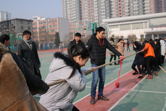 12月25日-29日,每天中午12:30,操场上就人声鼎沸,同学们兴高采烈地聚集到操场,等待比赛开始。 比赛过程中,各参赛队员同心协力,气氛异常紧张,富有节奏的呐喊声、加油声,充斥在操场上空,尤其是在胜负难分的时刻,大家毫不退却,咬紧牙关,坚持到底。绳子中间的红布带一会儿向南一会儿向北,场外的拉拉队个个热情高涨,呐喊助威给比赛增添了一抹亮色,把比赛的气氛一次次推到最高潮。