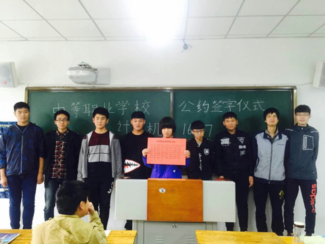 为培育和践行社会主义核心价值观,教育引导学生自觉养成良好的思想品质和行为习惯,2016年11月1日,学生处(团委)组织学生举行了《中等职业学校学生公约》班级签名活动。签名活动先由班主任老师负责详细解读《公约》内容,发出了“我签约我践行,争做优秀中职生“的倡议,号召同学们树立远大理想,从现在做起、从我做起、从小事做起,在日常的学习和生活中,践行《公约》要求,为建设文明和谐校园做出自己的贡献。