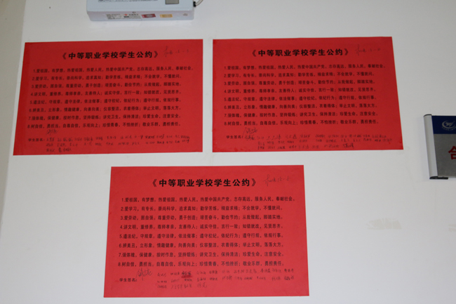 在每个班级,同学们郑重地在横幅上签下了自己的名字。他们表示,在《公约》签上名字,就等于签下一份承诺,在今后的学习生活中,一定要按照校规校纪严格要求自己,信守对学生公约的承诺,争做一名优秀中职生。