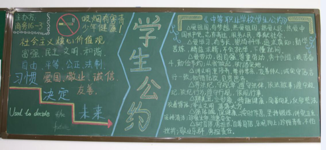 为了深入学习宣传《中等职业学校学生公约》,营造潜移默化的良好氛围,2016年11月8日,学生处(团委)组织学生处宣传部10余名同学开展班级黑板报评比活动。本期黑板报以《公约》为主题,《公约》是对中等职业学校学生思想品质和行为习惯的基本要求,是引导学生健康成长的基本规范,通过办理班级黑板报,让每位同学随时都能看到《公约》,随地能规范自己的行为。