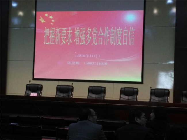 2016年11月10日,电子工程系教师、民进会员陈子聪和陈红伟赴华北水利水电学院,参加全省民主党派促进交流会议。在会议上,各民主党派人士学习了省委统战部副巡视员陈照顺同志关于把握新要求,增强多党合作制度自信的报告。大家对多党合作有了更深刻的认识。