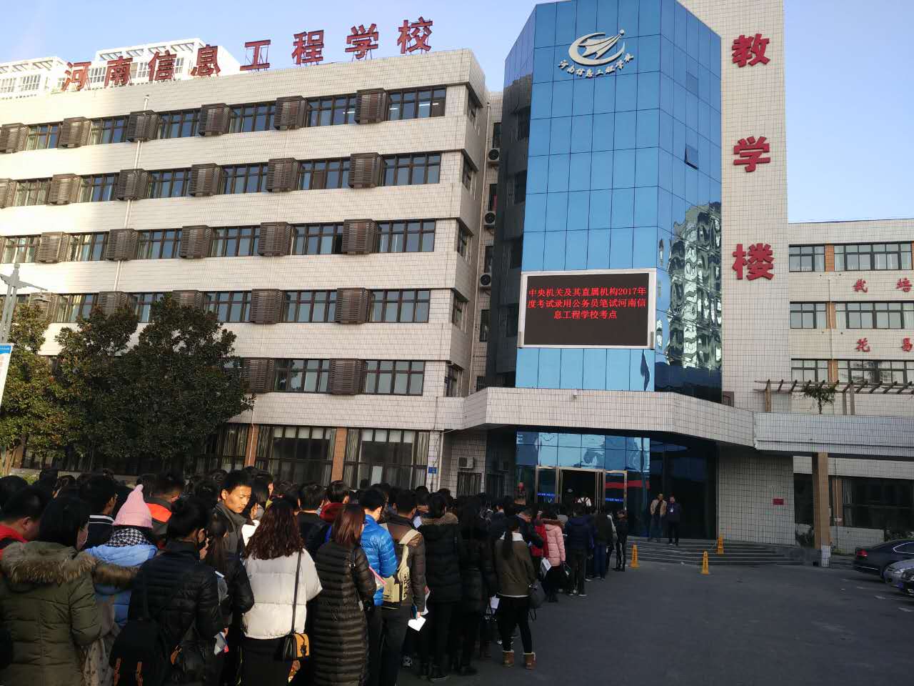 2016年11月27日,我校培训中心承接中央机关及其直属机构2017年度录用公务员河南信息工程学校考点笔试考试工作,时间为周日全天,上午考试专业:行政职业能力测验,时间:9:00-11:00,下午考试专业:申论,时间:14:00-17:00,使用教室50个考场,大屏四、五做考务办。