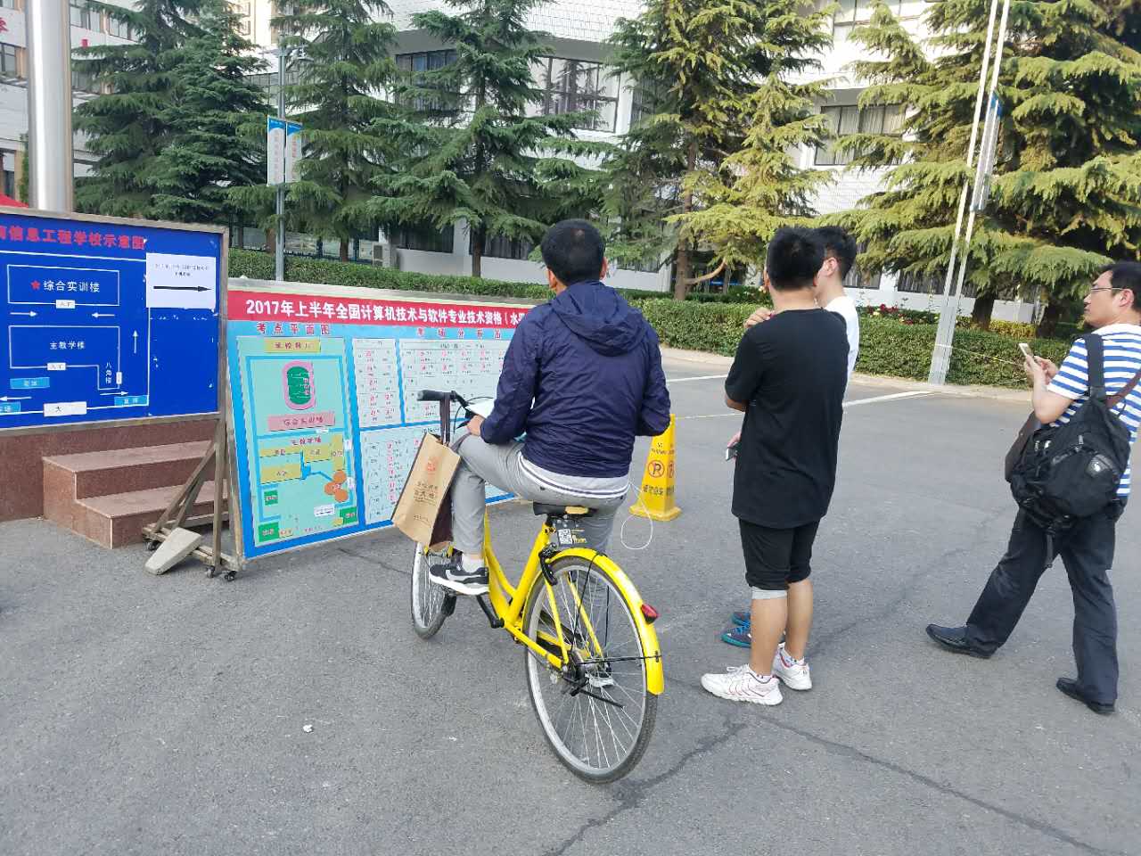 考生骑着共享单车来看考场