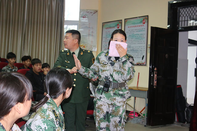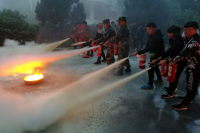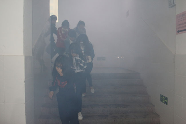 16点50分,武警官兵指挥同学们开展模拟火灾紧急疏散逃生演练。烟雾弹点燃后,同学们按照规划好的路线和警官讲解示范的动作要领有序的依次下楼,从教学楼撤离到楼外安全区域。在紧急疏散演练结束后,武警官兵教授我校学生代表学习灭火器使用方法,并实地进行演练。