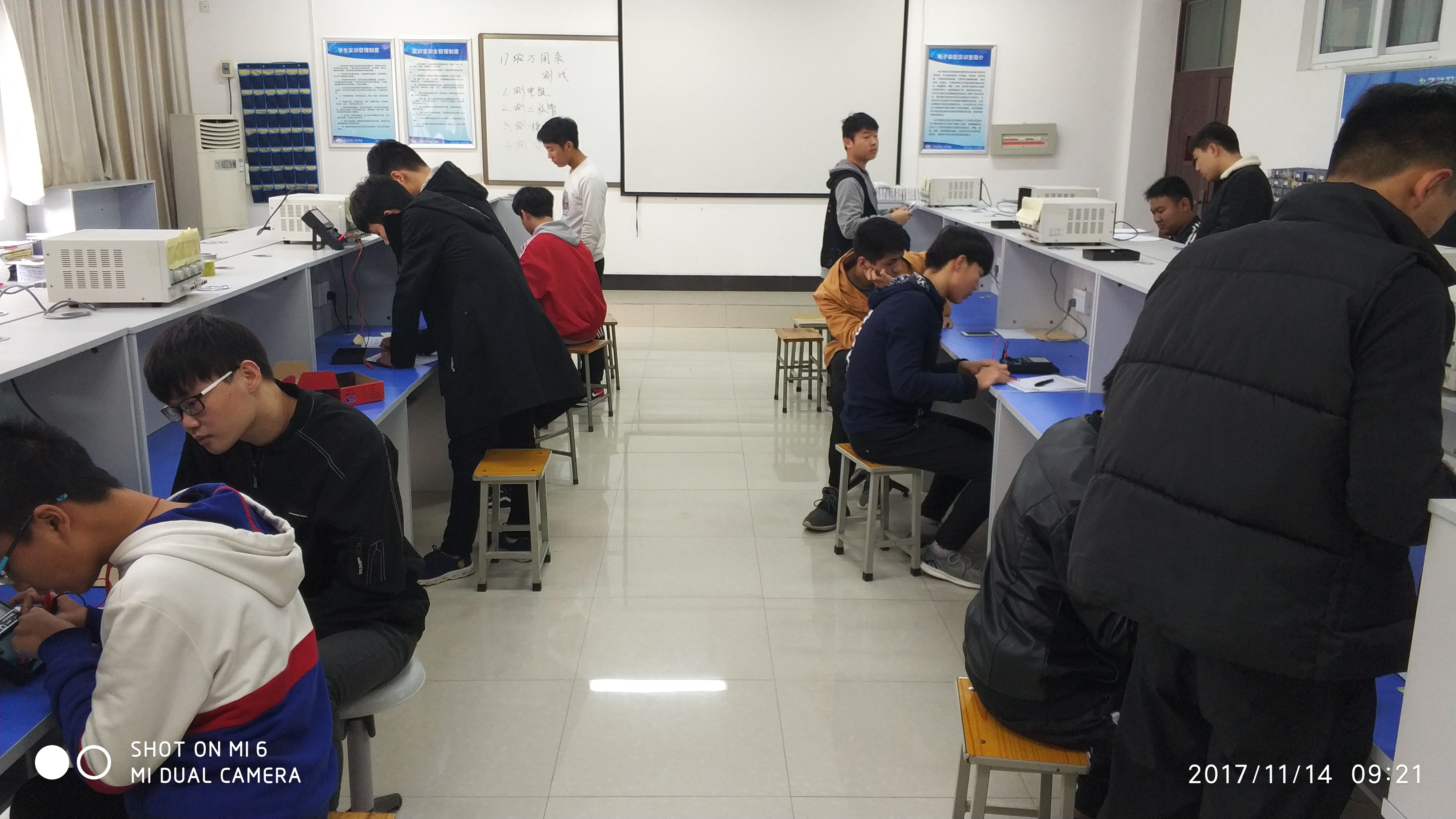 本次统考以单人考试的形式进行,17级学生自带装配的万用表参加考试。为了确保公平、防止作弊,考场内准备了八个考位,考生进入考场后,随机选择考位。每个考位上元器件均有差异,考试过程中,考生自主选择元器件进行测试。