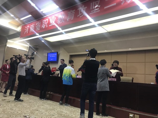 今年,河南省在全国职业院校技能大赛中共获得一等奖22个、二等奖43个、三等奖109个,成绩位居全国前列。我校计算机技术系学生郑浩荣获一等奖的荣誉,教育厅厅长朱清孟亲自为郑浩颁奖并握手鼓励。