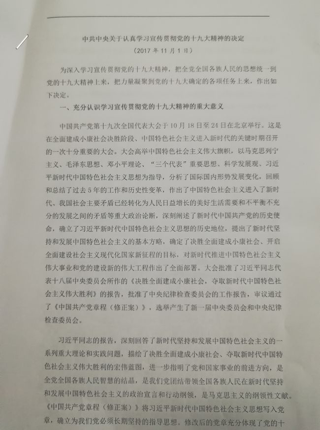 会上马副处长首先发言,他谈到学习十九大精神的意义以及对大家今后工作的指导作用,并激励大家要以校为家,将学校的发展与荣辱同自身相结合,有主人翁的责任感;他还谈到作为新时代的老师应该了解国家的发展并助力国家的发展。随后在马副 处长的带领下学习了十九大精神的重要内容及核心主题、历史地位和丰富内涵。并要求大家会后进行深入学习十九大,宣传十九大。