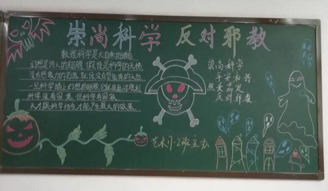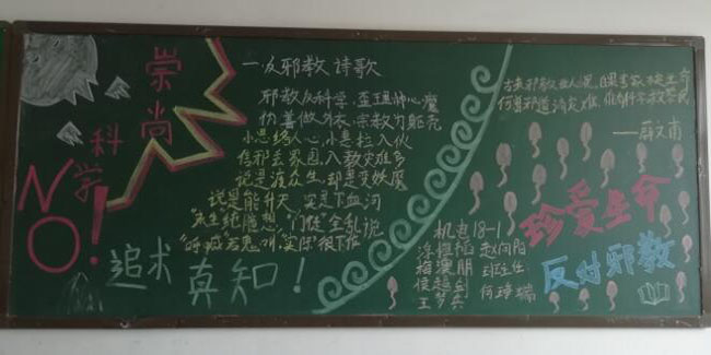 近日,根据有关单位通知精神,学生处(团委)在全校学生当中积极开展“崇尚科学 反对邪教”系列宣传活动。为了充分发挥黑板报的宣传阵地作用,2018年9月18日,学生处(团委)组织各班办理“崇尚科学 反对邪教”主题黑板报。