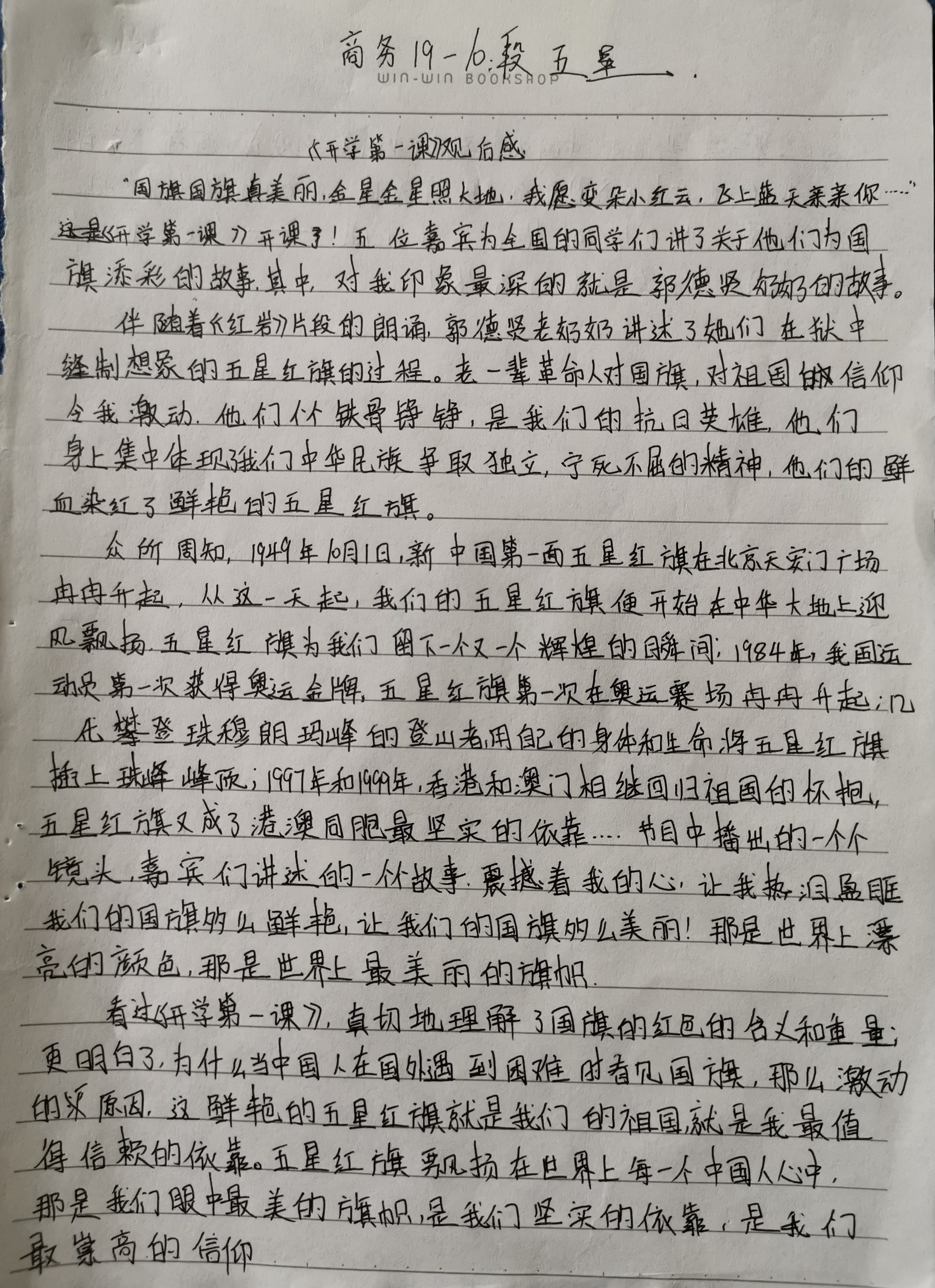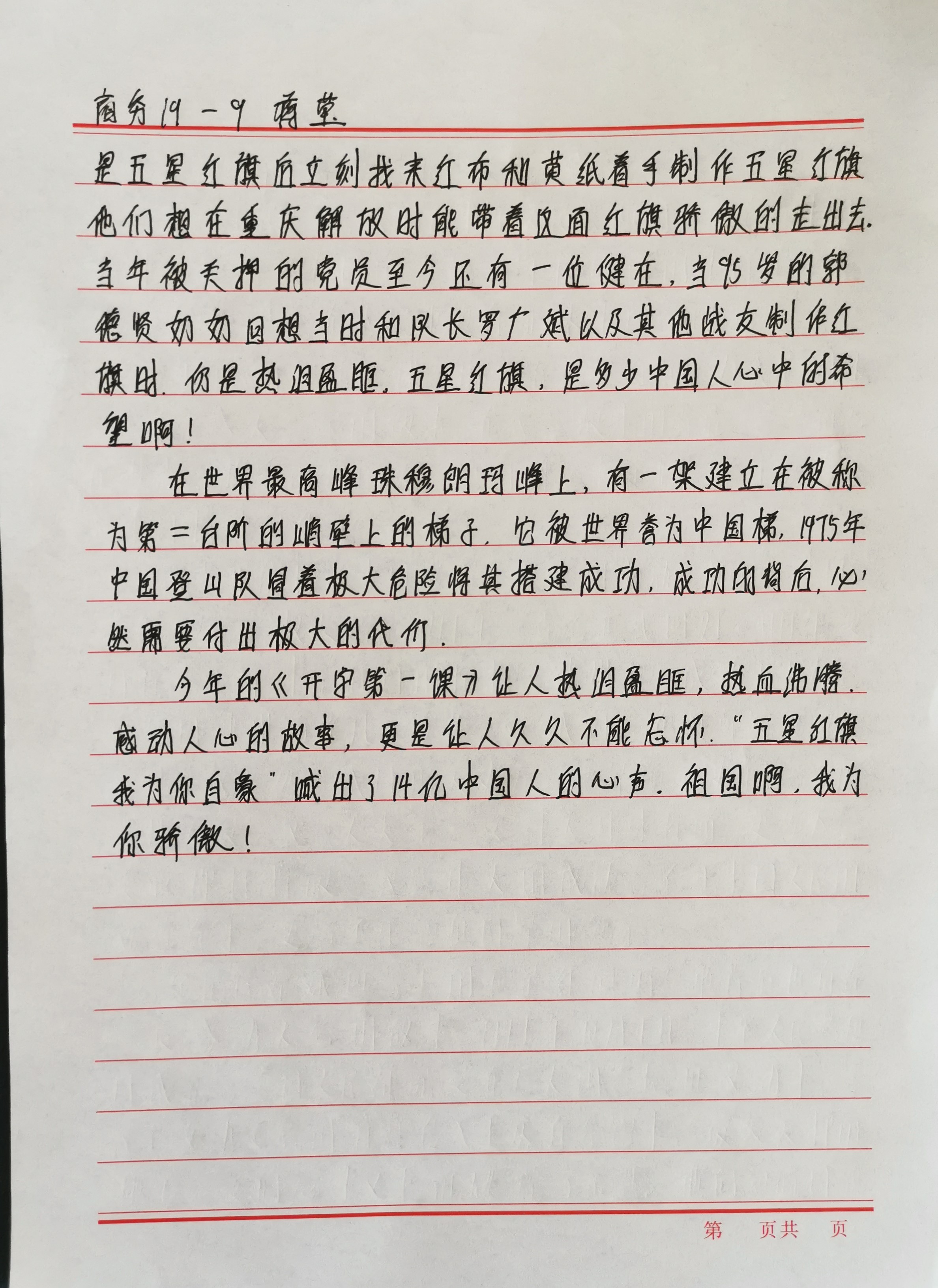 为隆重庆祝中华人民共和国成立70周年,高举中国特色社会主义伟大旗帜,以构建和谐向上的校园文化为主线,激励和引导广大青少年大力弘扬以爱国主义为核心的伟大民族精神,我校团委组织了《开学第一课:五星红旗:我为你自豪》观后感征文评比活动,现将评比结果通知如下: