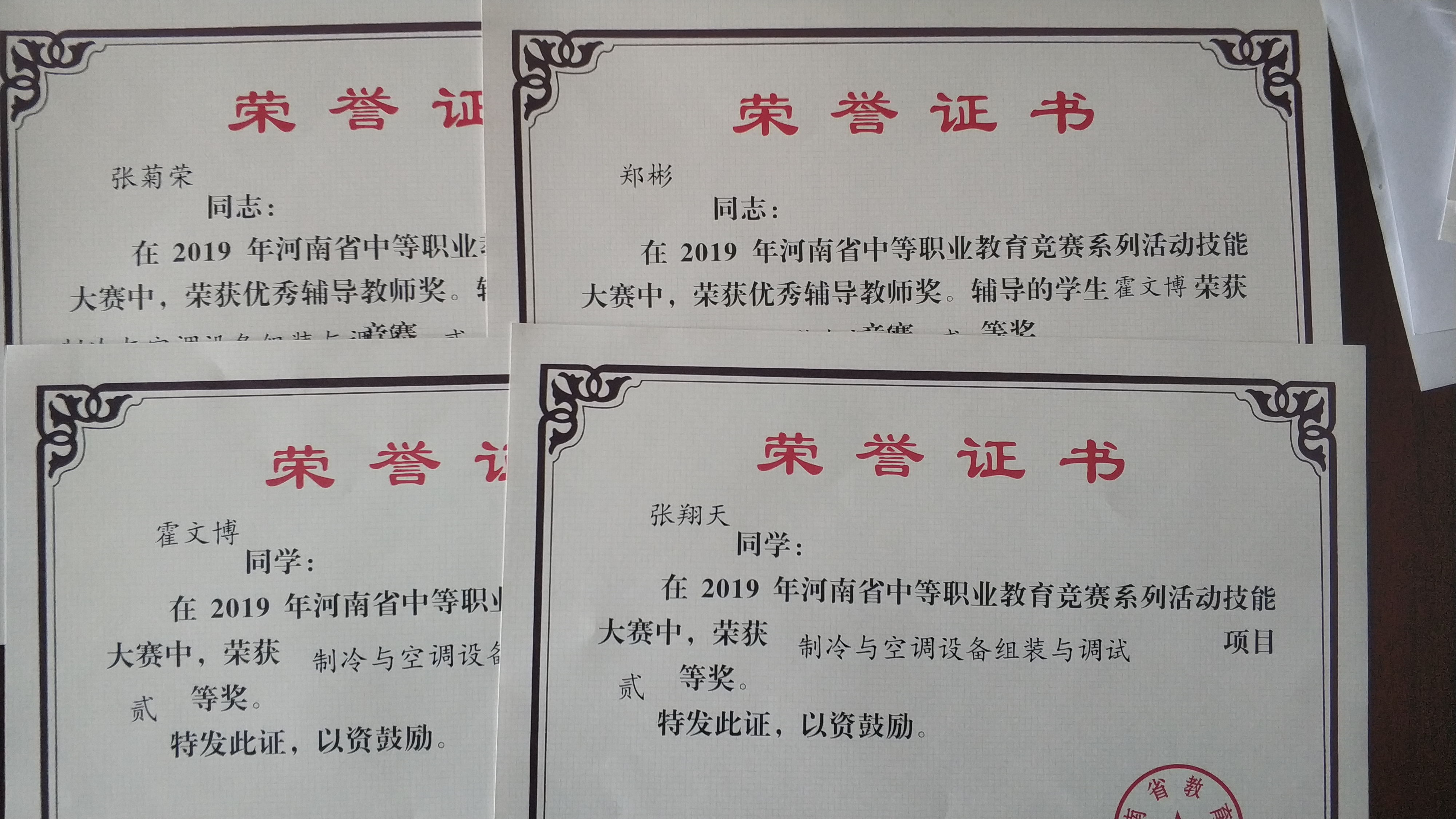 2019年10月18日-20日,2019年河南省职业院校技能大赛中职组制冷与空调设备组装与调试赛项在郑州市电子信息工程学校举办,我校电子工程系两名学生霍文博、张翔天代表我校参加了本次比赛,均获得二等奖的好成绩。