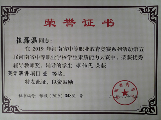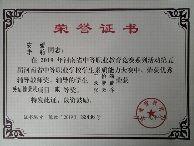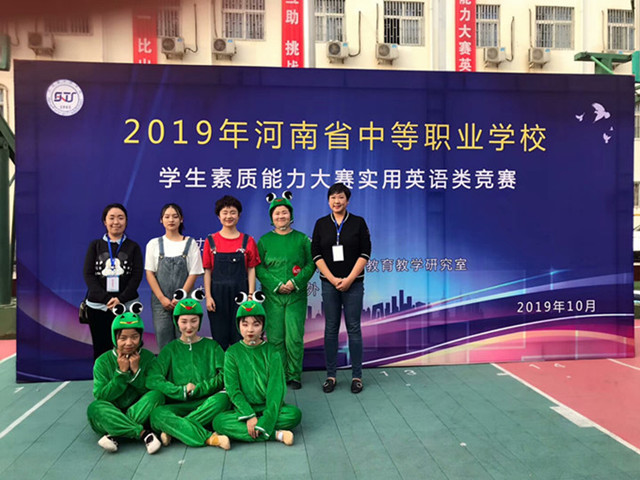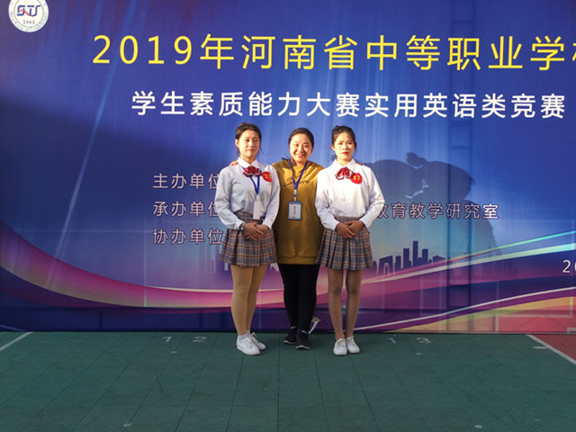 10月26、27日,2019年第五届河南省中等职业学校素质能力大赛英语演讲和英语情景剧比赛在河南省外贸学校举办,经过激烈比拼,我系学生李伟代,王怡涵、录带戴、张云乔等学生获得个人一等奖和三等奖,团体二等奖的优异成绩,四名辅导老师崔磊磊、李莉、安媛和朱晓雷获得“优秀辅导教师”称号。