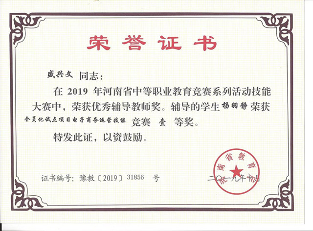 10月19日上午,2019年河南省中职教育技能大赛全员化试点项目电子商务赛项在河南省商务中等职业学校举办,经过激烈的比赛,我系学生李佳欣、李卓涵、杨羽静、李田田四名同学获得一等奖的优异成绩,王相萱同学获得二等奖的优异成绩。辅导老师盛兴文、尹顺丽、白一卓、李雪玲、刘伟等五名教师获得“优秀辅导教师”称号。
