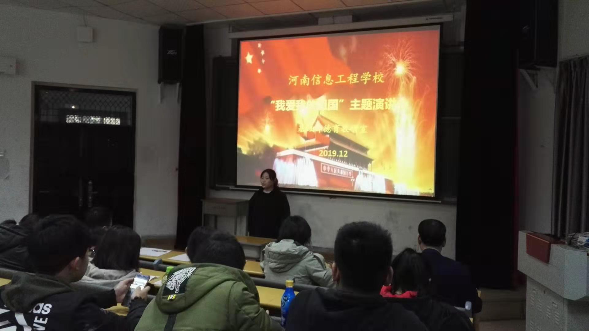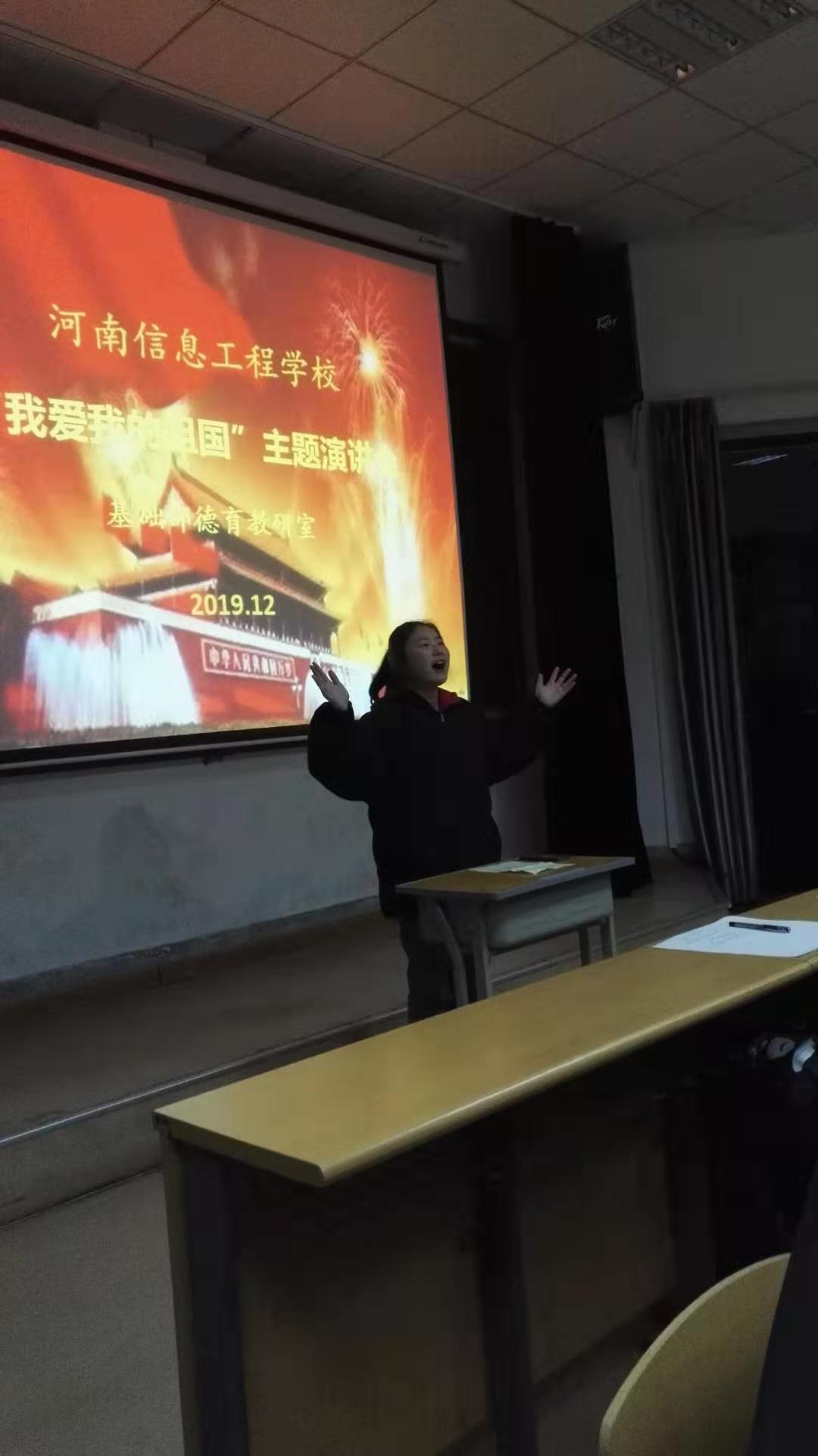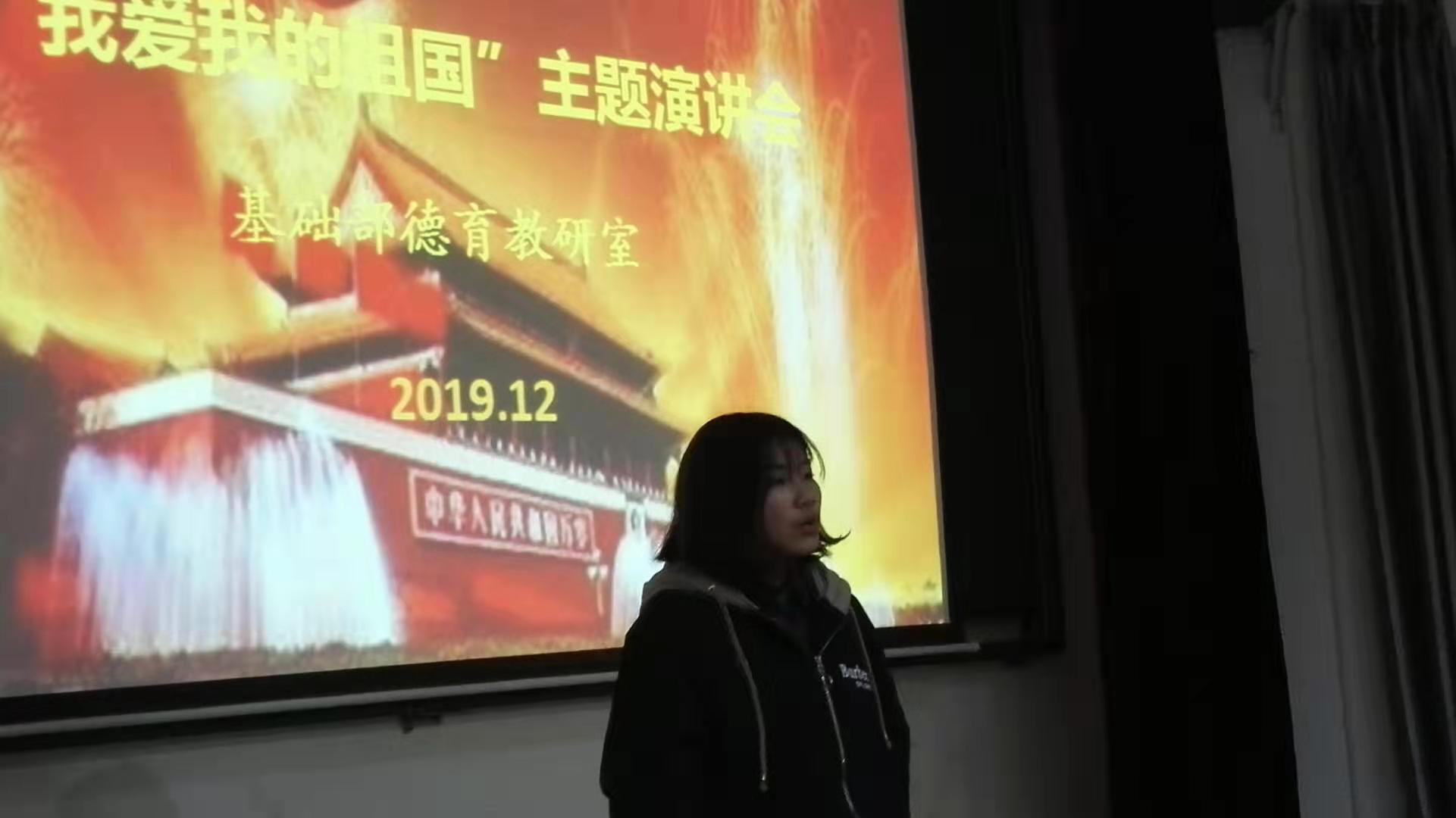 今年是新中国成立70周年,为了更好的在学生中树立爱国主义情感,激发爱国主义热情,表达青年学子对伟大祖国的热爱,思政教研室本学期举办了"我爱我的祖国"主题演讲会。在演讲会上,学生们深情表达了对祖国的热爱,有的赞美祖国的大好河山,有的讴歌祖国的建设成就,有的缅怀革命先烈。让学生受到一次很好的爱国主义教育。基础部思政教研室于2019年12月10日在大屏教室组织了学生思政第二课堂活动,本次活动中学生感慨激昂,声情并茂,精彩纷呈,达到预期的目的,取得很好的效果。