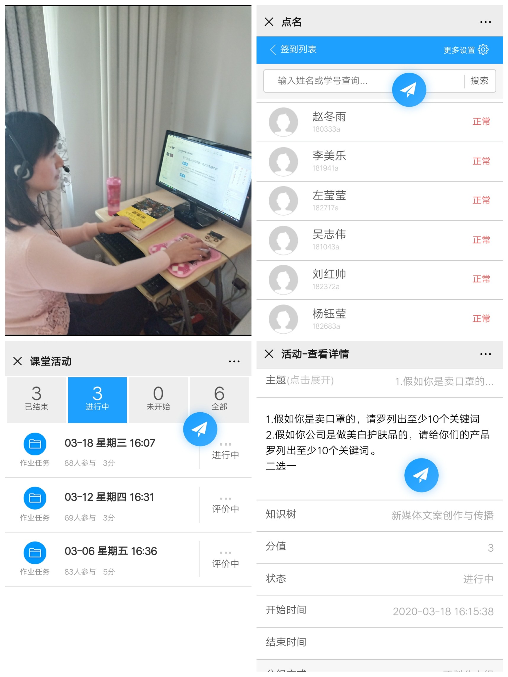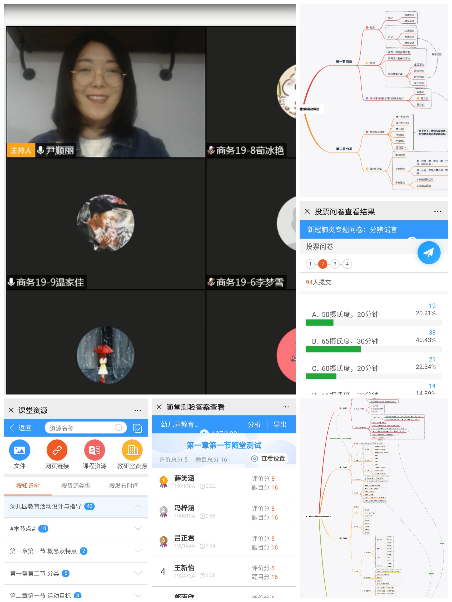 一:尹顺丽,讲师,我校商务系主任,省模范教师。在这次新冠肺炎疫情期间,尹老师综合运用直播平台、学校智能课堂平台等网络教学工具及微课、思维导图等多种信息化教学手段,开展疫情谣言调查问卷、随堂测、头脑风暴等多种课堂互动,在19级学前教育专业专业课直播教学中取得家长和学生的广泛好评。