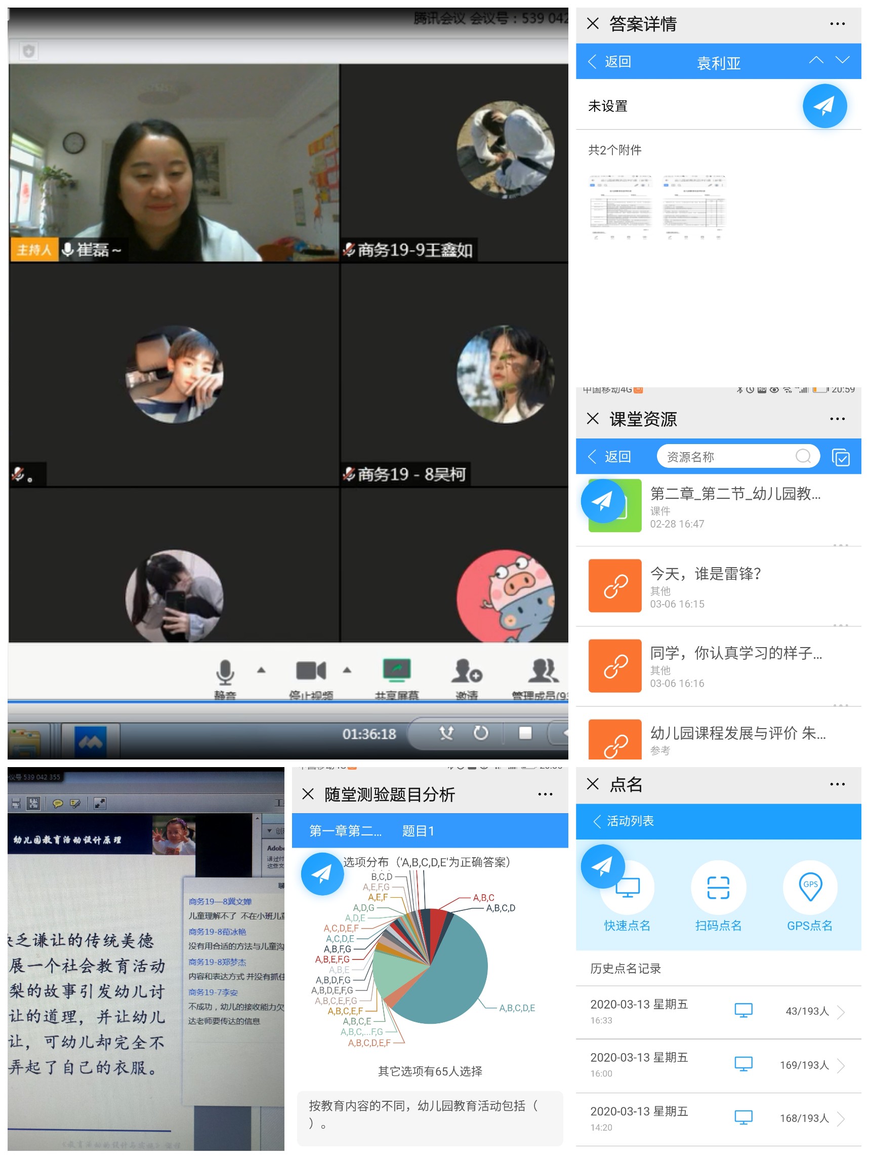 二、崔磊磊,本科学历,讲师,我校商务系副主任,学前教育专业课教师。曾获2019年河南省中等职业教育教师教学能力大赛一等奖、技能大赛说唱弹跳画项目优秀辅导教师三等奖。在这次新冠肺炎疫情期间,在学校率先组织学生进行了腾讯会议直播效果测试,并把直播经验分享给其他教师,同时与系部直播教师团队积极探讨智慧课堂和腾讯会议的有效结合。在直播教学中,积极开展随机签到、随堂测试、作业布置等教学方式;及时在智慧课堂上传与专业学习、疫情防控相关的PPT和PDF课件、直播录屏文件、教学链接等资源,在讲授专业知识的同时,让学生体会无数抗战在一线人员的辛苦,认真思考作为学生应该做些什么、应该怎么做。