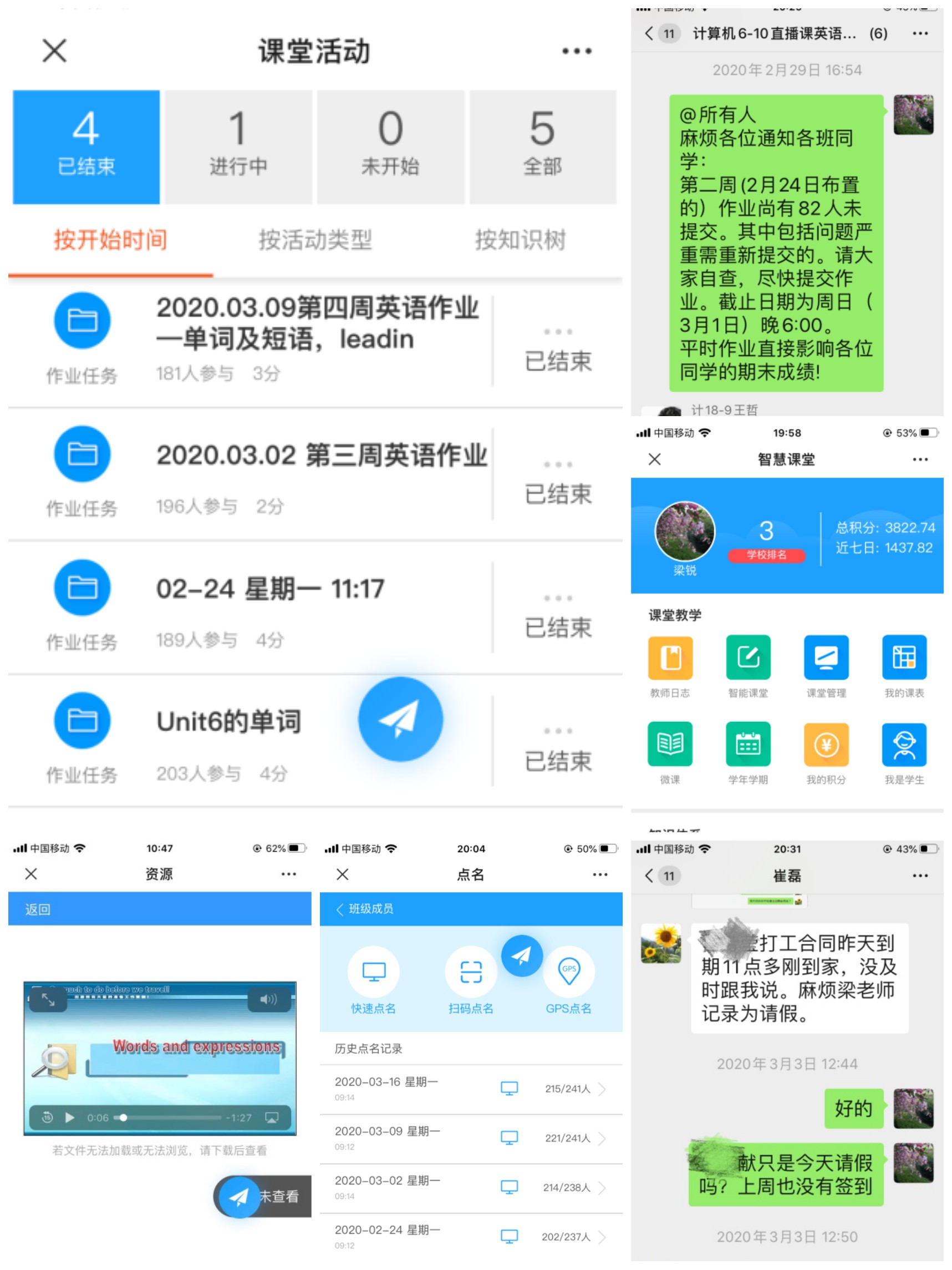 八、梁锐,教育硕士,高级讲师,我校商务系英语老师。在本次疫情期间,她担任了共10个班级的直播课程。接到任务后,梁锐老师学习腾讯直播软件、建立直播课班级、利用现代化教学技术制作小微课,尤其是单词拼写、音标、读音为一体的小视频很受学生和其他老师的欢迎。教学期间利用智慧课堂的资源功能,将教学PPT、链接网址和自制视频等资源放进班课中,利用点名、作业任务等功能监管学生上课及作业情况。直播课堂讲解知识点之后,课下利用微信、智慧课堂及时与班主任和学生沟通,多角度关注学生上课及学习动态。