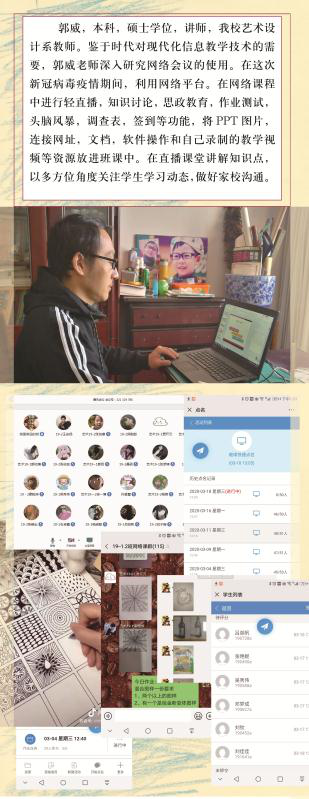 胡丹丹,硕士研究生,讲师,艺术设计系专职教师。在这次新冠病毒疫情期间,她结合多种信息化教学方法进行网上教学,将智慧课堂、腾讯会议、微信、抖音视频等多重信息化手段融入课堂中。特殊时期,利用网络完成了备课、上课、布置作业,课堂上不仅专注于知识传授,同时加入课程思政内容,增加与同学的互动,关注学生思想动态,及时向正确的方向引导。并利用微信群加强了课下与学生的沟通,尽量做到学生随时有问题随时解决,较大程度减轻了隔空授课的弊端。