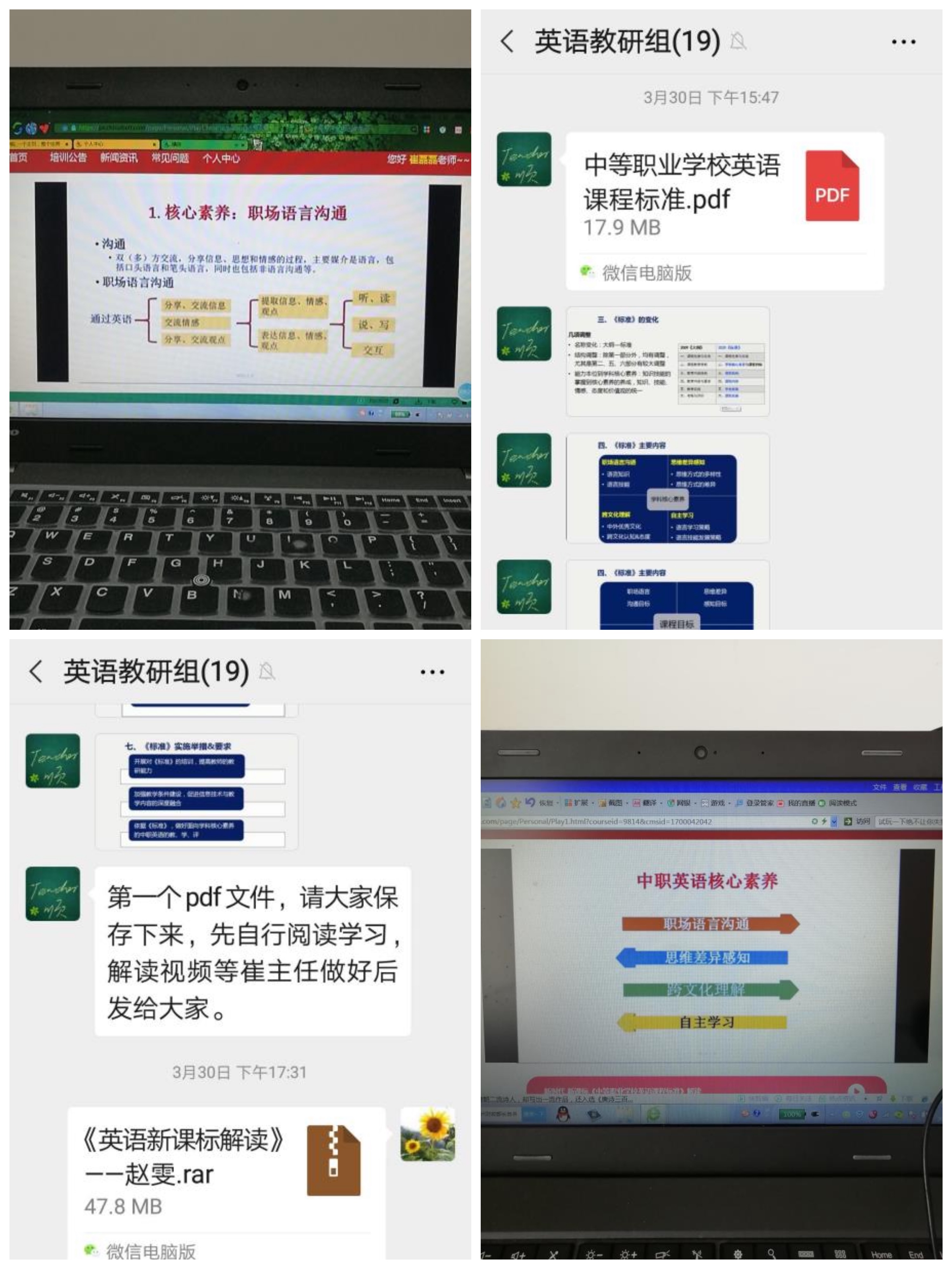 根据教育部职业技术教育中心研究所《关于开展中等职业学校10门公共基础课课程标准培训的通知》,3月30日14:00—17:00,商务系主任尹顺丽、副主任崔磊磊、英语专业教师谭进、梁锐参加了由教育部职业技术教育中心研究所主办、高等教育出版社承办的课程标准在线培训。