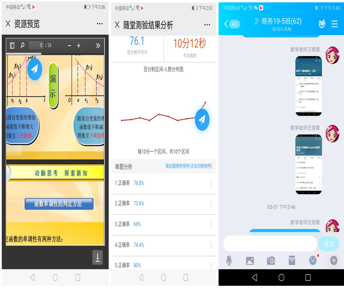 王煜霞,本科,讲师,数学教研室骨干老师。在新冠肺炎疫情期间,王老师担任商务系19级1—5班和计算机系19级1—5班共10个班的数学线上直播教学工作。课堂教学中,王老师通过课堂讨论、课堂提问、头脑风暴、随堂练习、签到活动、课后测试等形式灵活组织教学。课间,她还针对疫情这个特殊时期对同学们进行思想政治引导、心理疏导和防疫指导。课下,她积极督促同学们做好预习、复习,及时完成及提交作业,同时在学校智慧课堂平台上传教学ppt、教案、录课视频等教学资源。为了提高学习效果,王老师还向同学们推荐了自己精心挑选的中国大学慕课的相关教学内容。在师生共同努力下,同学们真正做到了“停课不停学”,疫情期间在家学有所得,达到了预期教学效果。