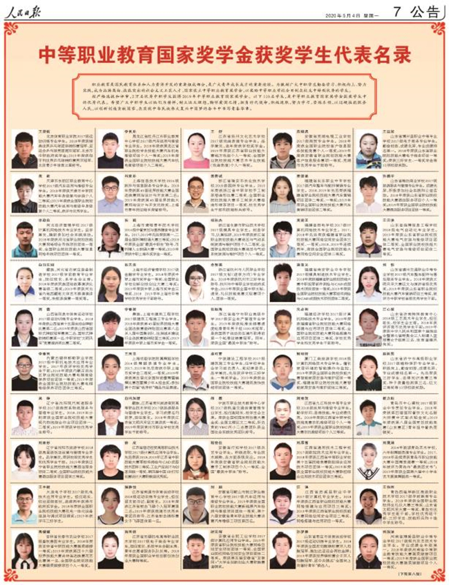 值此“五四”青年节之际,中共中央总书记、国家主席、中央军委主席习近平代表党中央,向全国各族青年致以节日的祝贺和诚挚的问候!国家在人民日报、职教圈等媒体平台公布了110名本专科生国家奖学金获奖学生代表名录和110名中职生国家奖学金获奖学生代表名录。中等职业学校我省共7名学生获此殊荣,我校2017级学生张乐名列榜中。