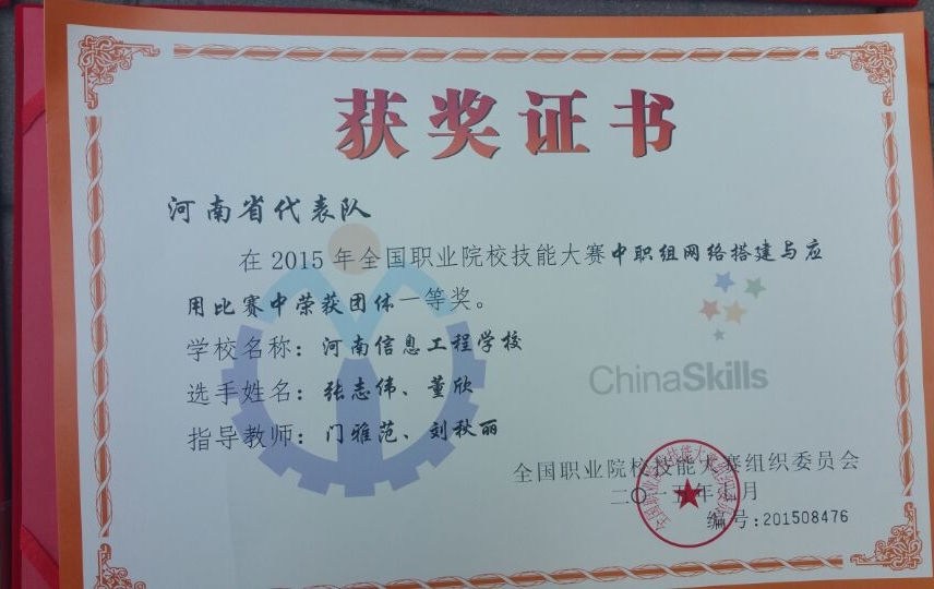 多年来,培养的学生在全国各项技能竞赛中表现突出,分别于2007、2013、2014、2015、2017、2018六次荣获全国技能竞赛一等奖,2009-2015年蝉联河南省技能竞赛”网络搭建与应用”赛项一等奖第一名,2013-2018年蝉联河南省技能竞赛“网络综合布线”一等奖,2019-2022年蝉联河南省技能竞赛“计算机网络装调”赛项一等奖。