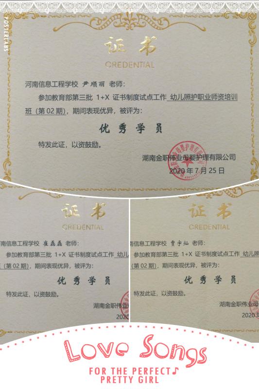 我系学前教育专业教研组骨干教师于2020年7月19日—2020年7月25日参加了教育部1+X证书制度试点幼儿照护师资培训课程学习和实训,顺利通过考核,五位教师均取得了幼儿照护师资培训证书和职业技能等级证书考评员证。其中,尹顺丽、崔磊磊、贾宇灿三位老师被评为优秀学员。