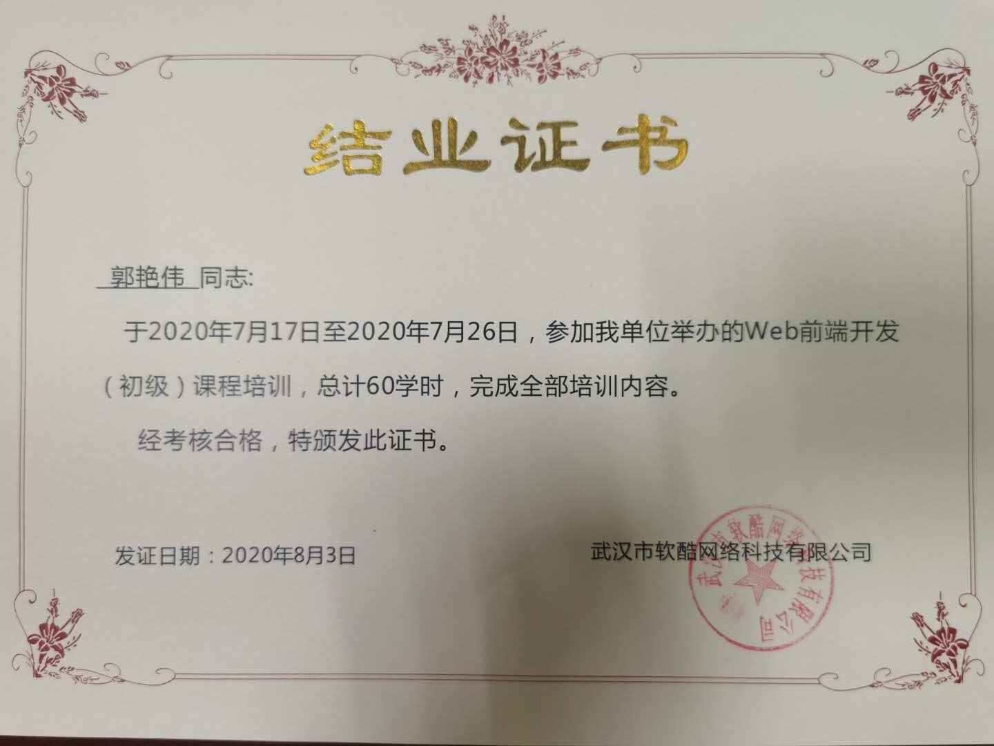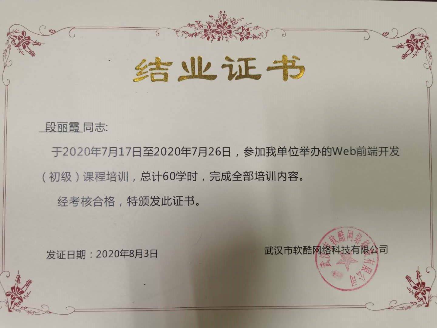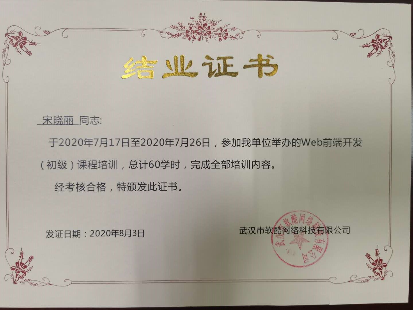 2020年7月17至26日,计算机系6名教师参加WEB前端开发技能培训班。虽然是高温酷暑天气,老师们丝毫没有懈怠,经过10天的认真学习与项目实战演练,6名教师全部通过了最终的结业考试,跟上了时代的要求,提升了我系的师资水平,为今后开展1+X培训和考试工作夯实了基础,也将进一步提升计算机应用专业的培养质量,在此向她们表示祝贺!