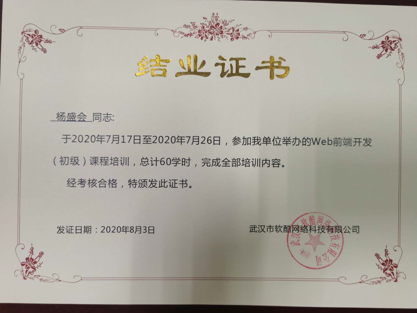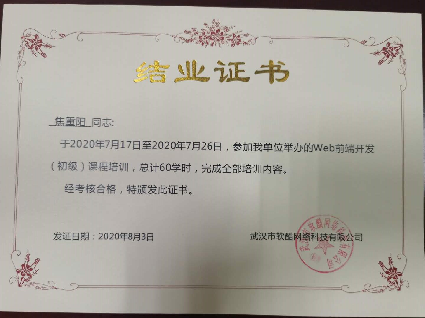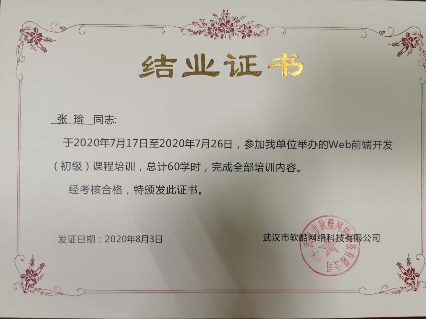 2020年7月17至26日,计算机系6名教师参加WEB前端开发技能培训班。虽然是高温酷暑天气,老师们丝毫没有懈怠,经过10天的认真学习与项目实战演练,6名教师全部通过了最终的结业考试,跟上了时代的要求,提升了我系的师资水平,为今后开展1+X培训和考试工作夯实了基础,也将进一步提升计算机应用专业的培养质量,在此向她们表示祝贺!