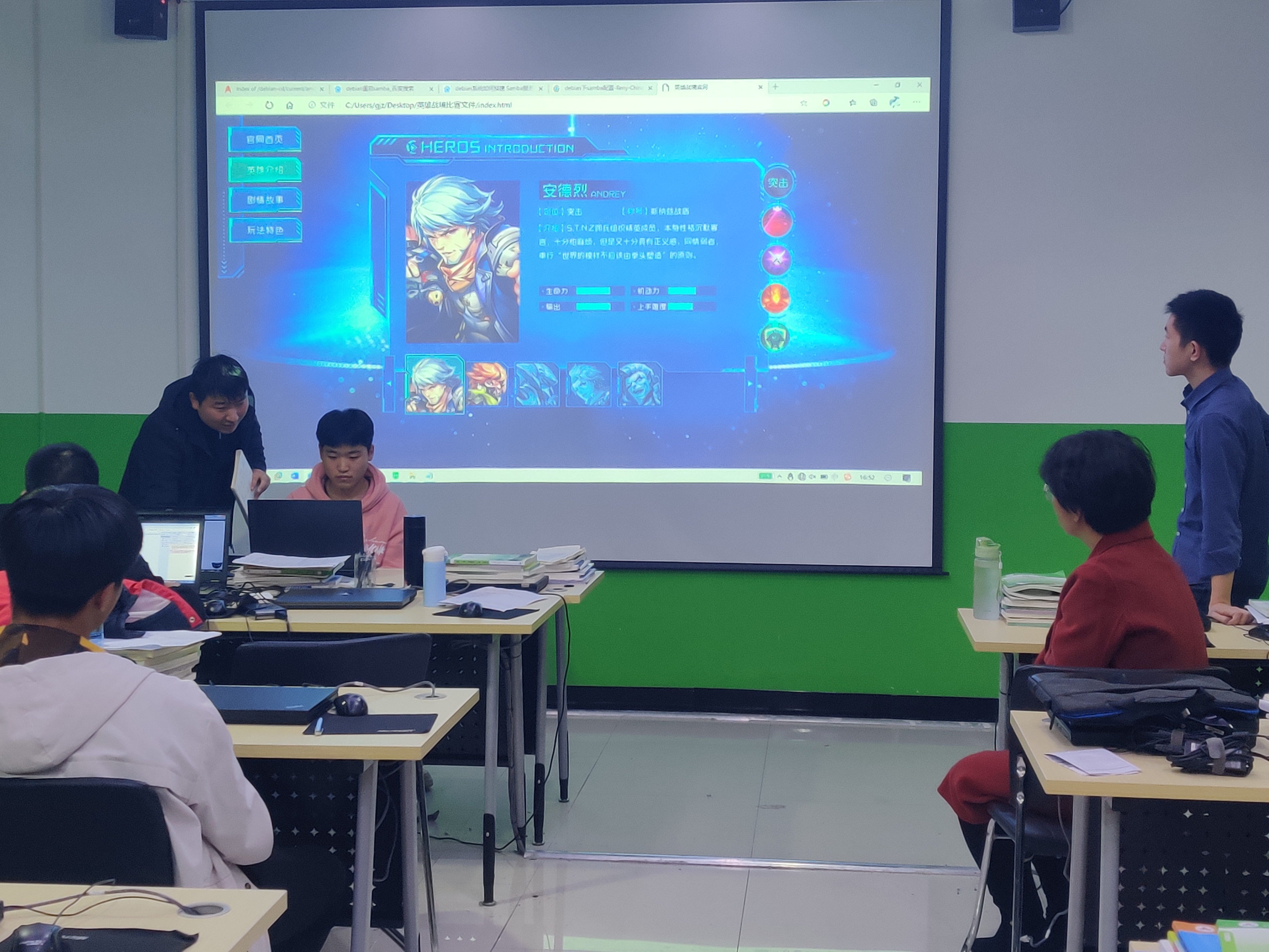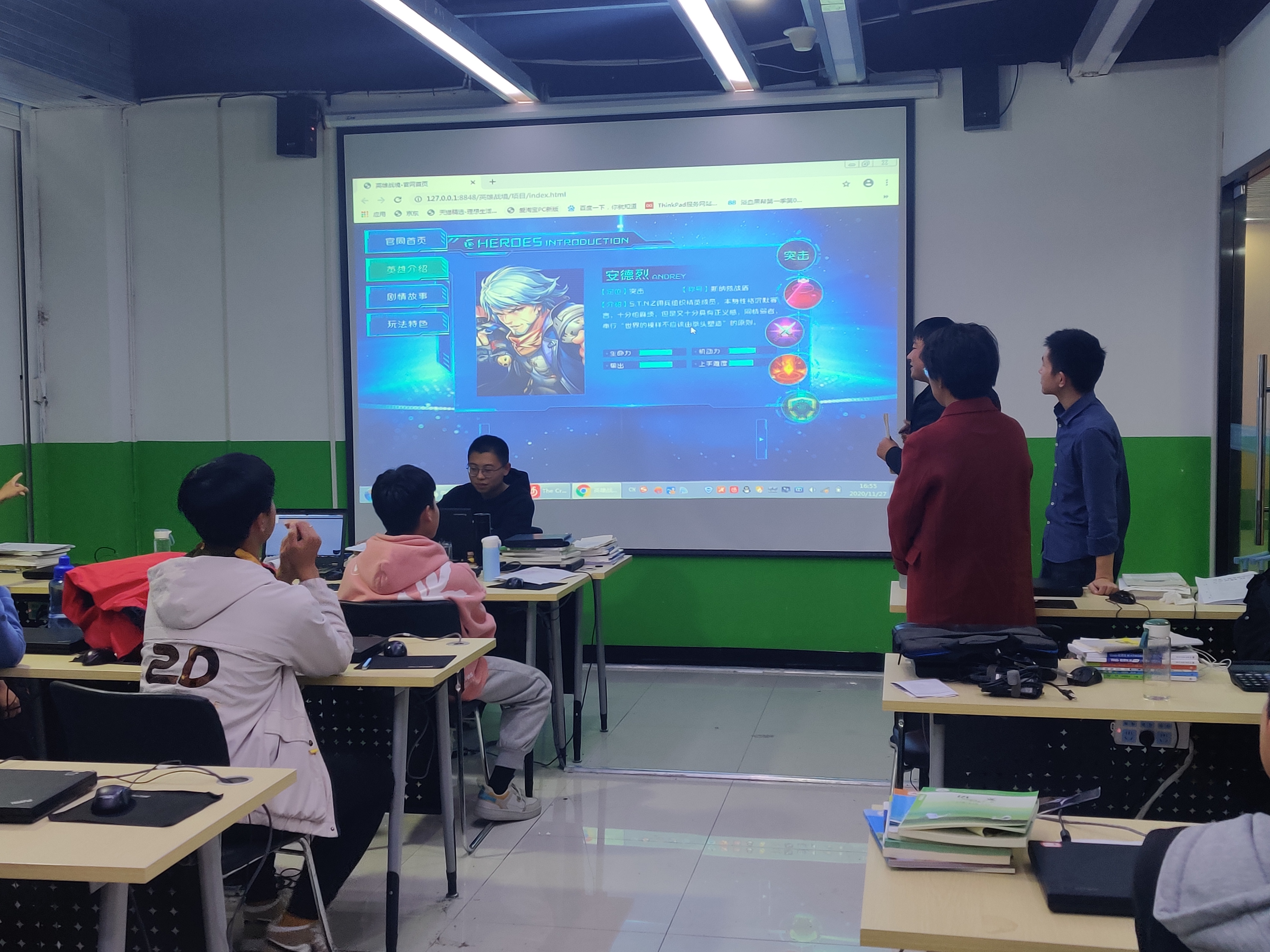 这次web前端技能竞赛共参与了6个班,设计要求是一个游戏网站的界面,统一提供图片素材,同学们各自设计动手设计自己的网站界面效果和动画效果。参与竞赛的同学的学习时间虽然不足3个月,但已展示出巧妙的创意设计和代码编写能力,而且思路巧妙,各有亮点,令参与评判的老师都觉得目不暇接,脑洞大开。