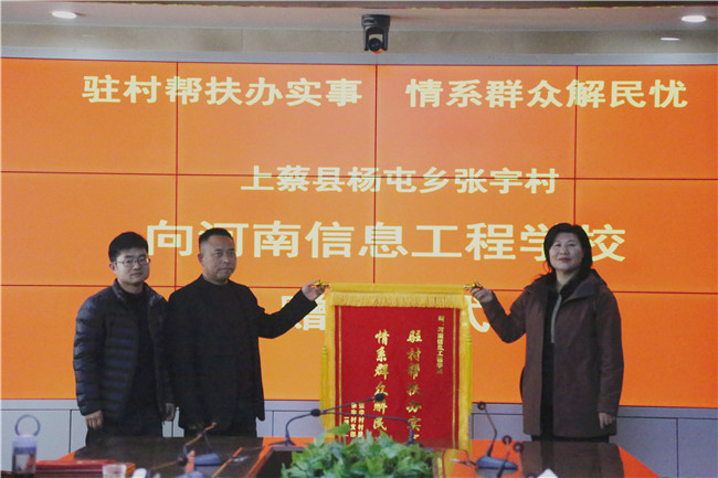 2021年3月23日上午,上蔡县杨屯乡政府及张宇村村委领导一行莅临我校,向我校赠送写有“驻村帮扶办实事 情系群众解民忧”的锦旗,感谢我校长期以来对张宇村脱贫工作的支持。省工信厅人事处一级调研员董建明出席了赠旗仪式。