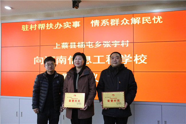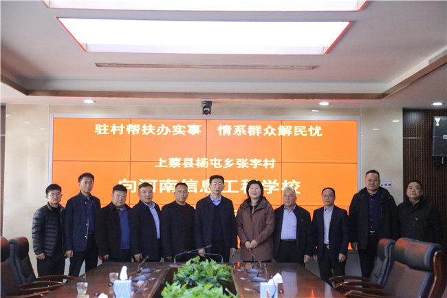 2021年3月23日上午,上蔡县杨屯乡政府及张宇村村委领导一行莅临我校,向我校赠送写有“驻村帮扶办实事 情系群众解民忧”的锦旗,感谢我校长期以来对张宇村脱贫工作的支持。省工信厅人事处一级调研员董建明出席了赠旗仪式。