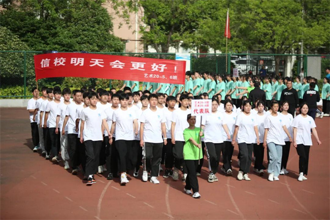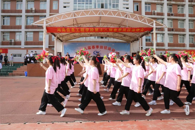 由河南信息工程学校鲜花方队、红旗方队、表演方队及各班组成的运动员方阵服装整齐、步履铿锵入场,他们的身上体现着信校师生奋发有为、昂扬向上的时代风采,团结奋进、开拓进取的精神风貌。