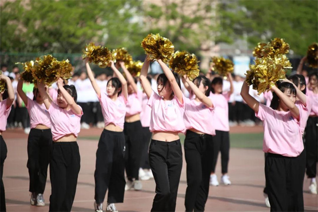 伴随着青春舞曲《YES!OK》,我校啦啦操方队表演了动感十足的啦啦操舞蹈,为即将比赛的运动员们加油鼓劲。