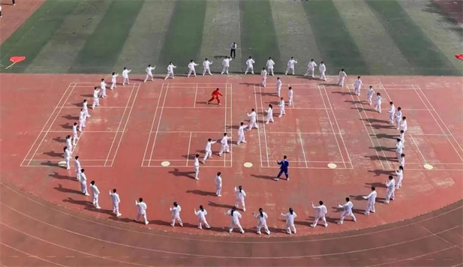 身穿白色太极长袍,在沉静舒缓的音乐中,太极方队的同学们动作行云流水,飘逸绝尘,将队形时而变换成太极图,时而变换成方形,让现场师生感受到了传统文化之美。