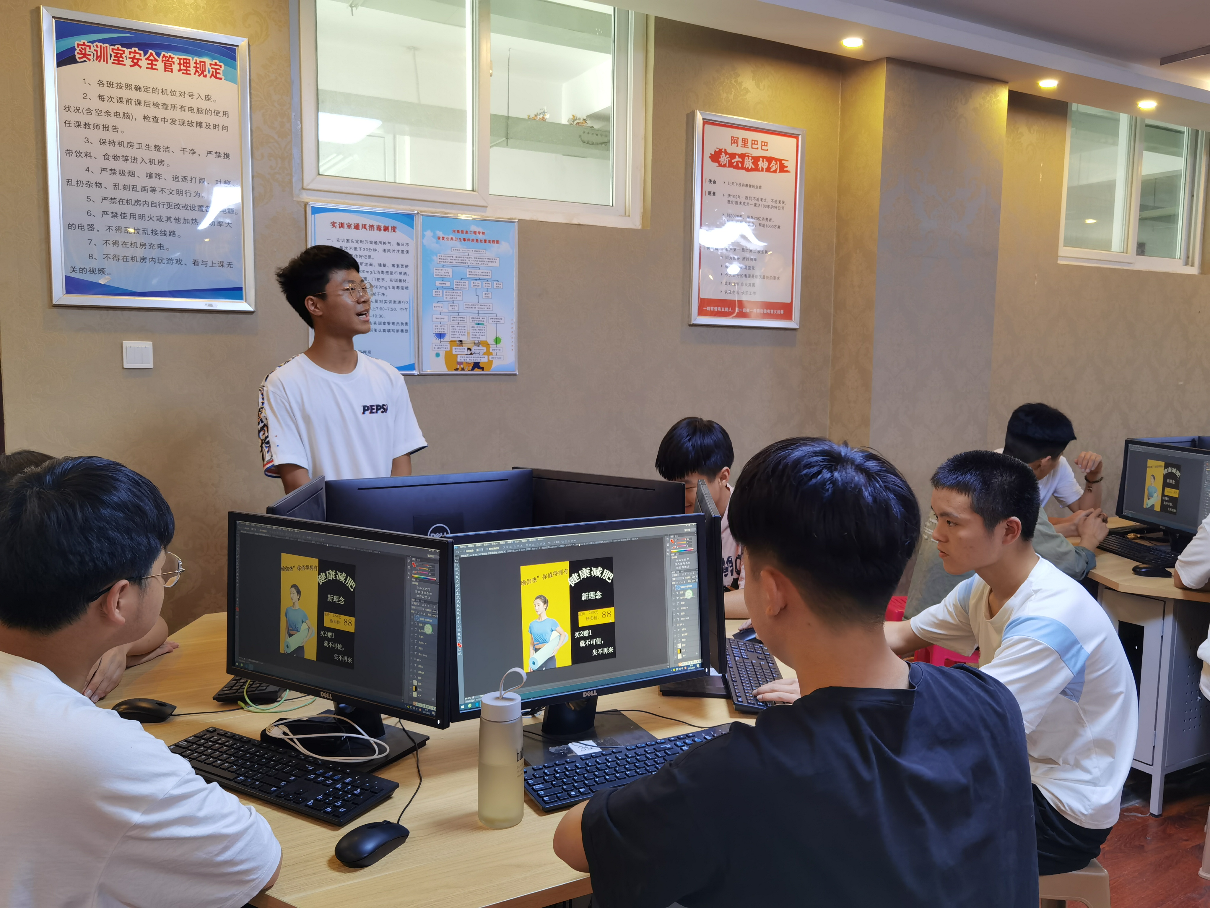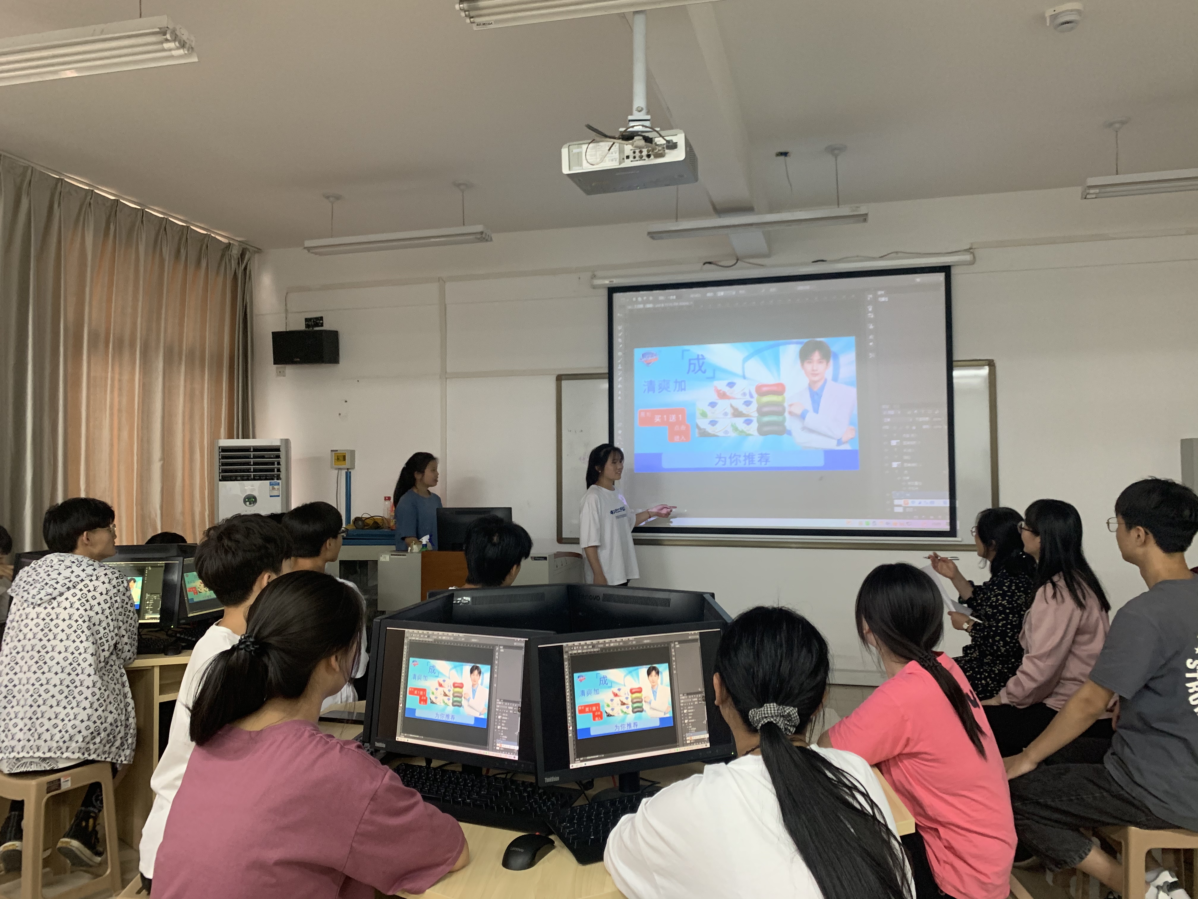 2021年5月25日,商务系在实训楼501、503、505教室同时开展了20级电子商务专业“店铺装修技能展演”的评比活动,同学们现场进行电商产品主图、店铺logo、网店banner设计思路和创意展演。这次展演活动全员参与,20级全体学生400余人,电商组全体教师参加。不仅对电商教学成果进行了一次综合汇报,也为学生们搭建了展示自我的平台,学生们同台竞技,各有创意。展演后,评委老师对每个班级的展演作品进行了专业的点评与指导,并选拔出参加系部第二轮展演的选手。