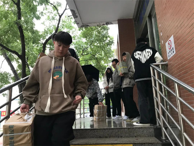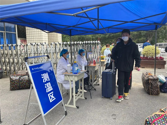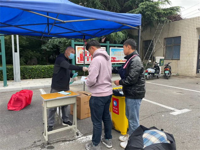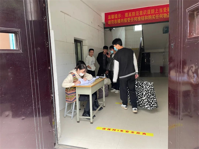 早上7:30开始,迎接返校报到的工作人员在学生处的牵头下,认真做好学生报到的各项准备工作。报到现场从校大门一次排队进入,秩序井然,返校学生严格遵守“查验健康码-行程码-测温-手部消毒-行李消毒-更换口罩”等流程进入校园。然后到宿舍登记,上交健康信息表和承诺书,到宿舍入住。学生处与党政办、教务处、总务处、保卫处、食堂管理处等有关部门统筹协调、分工协作、密切配合,做好学生返校报到现场周边的秩序维护和身份核验、交通管制引导、行李消杀、测温消毒、学生餐饮、发放书籍等工作,为学生安全平稳有序返校保驾护航。学校值班教师、班主任等工作人员为学生搬运行李,提醒学生按流程按受检查,积极助力学生返校复学。