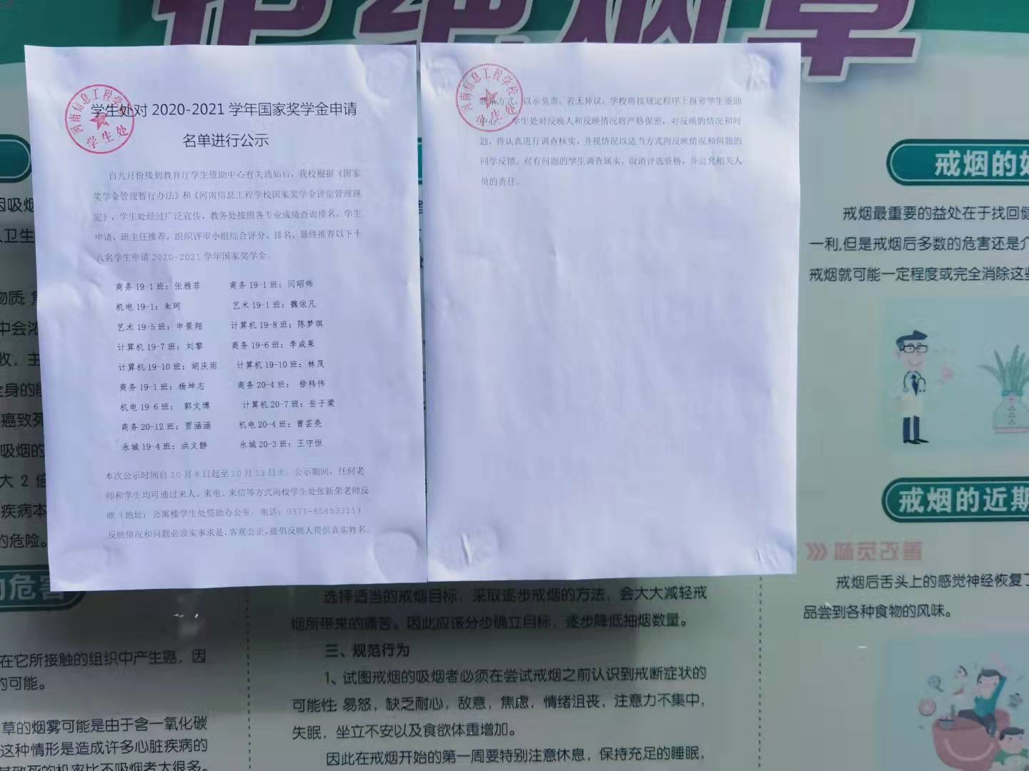 自九月份接到教育厅学生资助中心教资助[2021]355号有关通知后,我校根据《国家奖学金管理暂行办法》和《河南信息工程学校国家奖学金评定管理规定》,学生处经过广泛宣传,教务处按照各专业成绩查询排名,学生申请,班主任推荐,组织评审小组综合评分、排名,最终推荐以下十八名学生申请2020-2021学年国家奖学金。