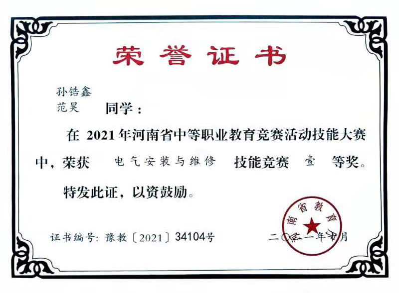 机电工程系参加2021年河南省中等职业教育技能大赛装备制造类电气安装与维修项目比赛,比赛于10月15日至17日在郑州市电子信息工程学校举行。机电工程系范昊、孙锆鑫两位选手经过激烈比拼,取得了一等奖的好成绩。