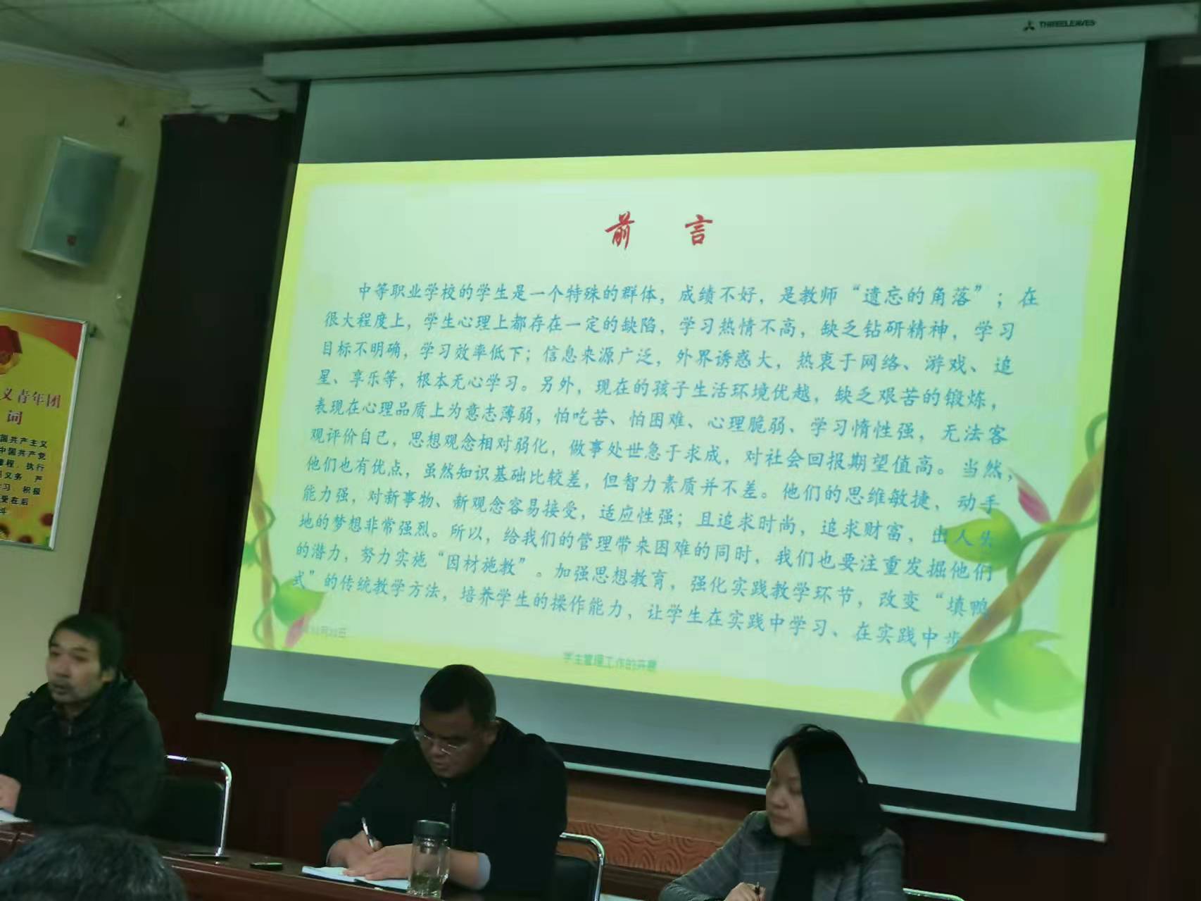 最后,冀处长对班主任职责再次进行了解读,要求班主任用科学严格管理,创新的做法,狠抓学生行为规范的养成,尽快形成良好的校风。