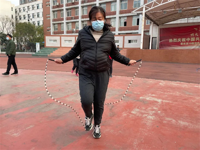 跳绳是一种古老的民俗娱乐活动,我国汉代已经有跳绳活动,是一种有效的有氧运动。为激发教职工的参与热情,跳绳项目设置为每名选手连续跳绳30秒,以次数计成绩。一声哨响教师们各展所长,有双脚跳、单脚交替跳,还有反向跳,参赛教师弹跳有力,英姿飒爽,绳舞飞扬,周围师生都被这热烈的场面感染了,“停!”裁判员大声喊道,参赛教师已经疲倦的身体依然精神抖擞,每个人脸上都洋溢着笑容。