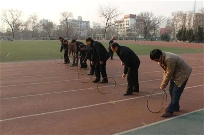在红色跑道上,每组参赛教师手捏顶头“U”字形的铁棍站成一排准备开赛。推铁环,是一项旧时传统儿童游戏,在二十世纪六七十年代盛行于全中国。玩家用铁丝做一个圈,然后再做一个长柄的铁钩子,推着这个铁丝圈滚着走。我校组织的推铁环比赛采用的是50米个人赛。比赛场上欢声笑语,掌声阵阵,老师们通过各个项目不但锻炼了身体,也仿佛回到了童年时代。