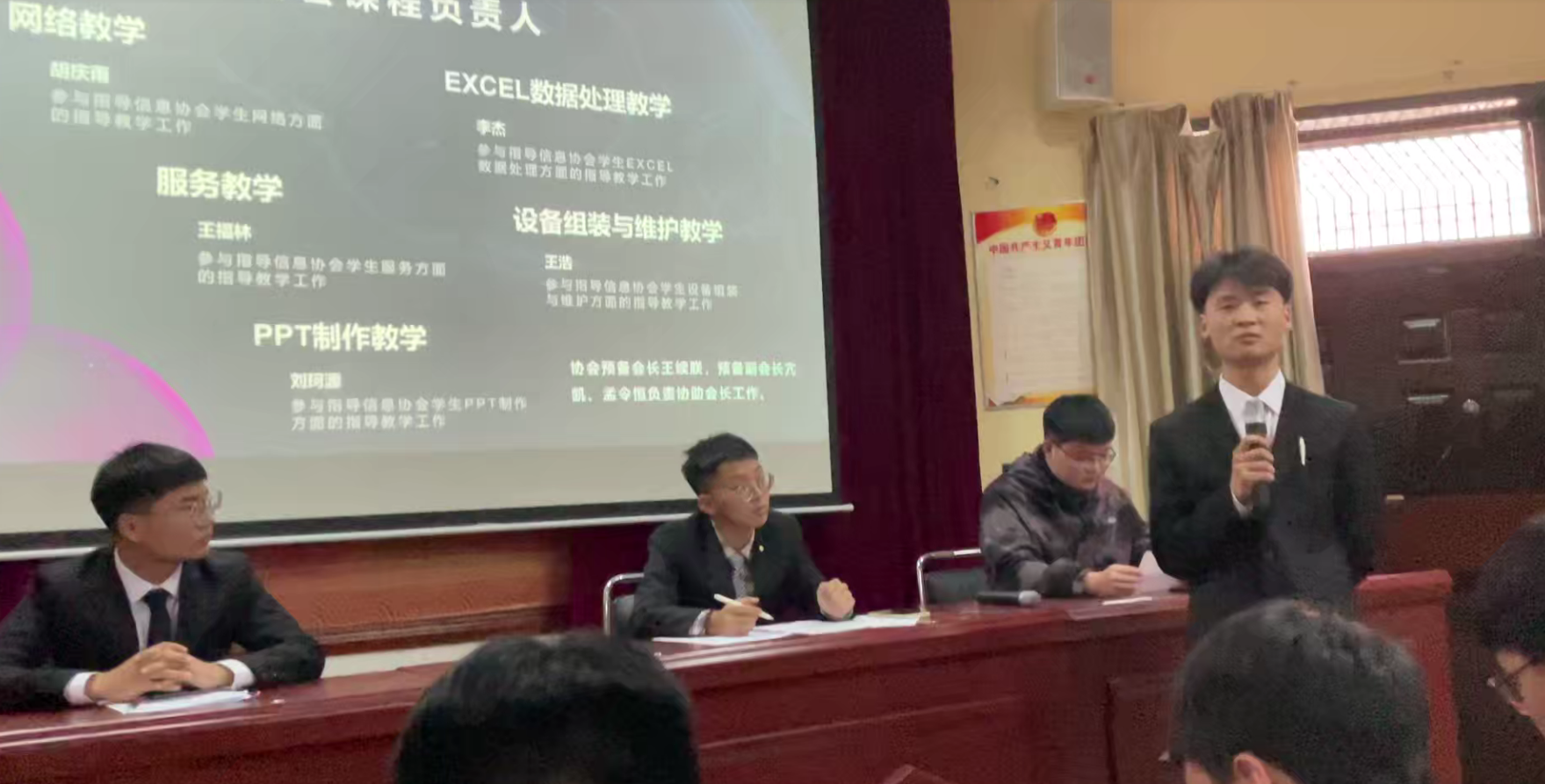 其次传达了信息协会举办的初衷是为了让同学们更好的学习计算机技术和培养计算机技能竞赛的选手,为同学们提供平台和机会,在协会内营造你追我赶的竞争氛围,同时也介绍了各个竞赛赛项的特点、规则以及竞赛中的所获得的荣誉对个人未来前程发展的助力优势。