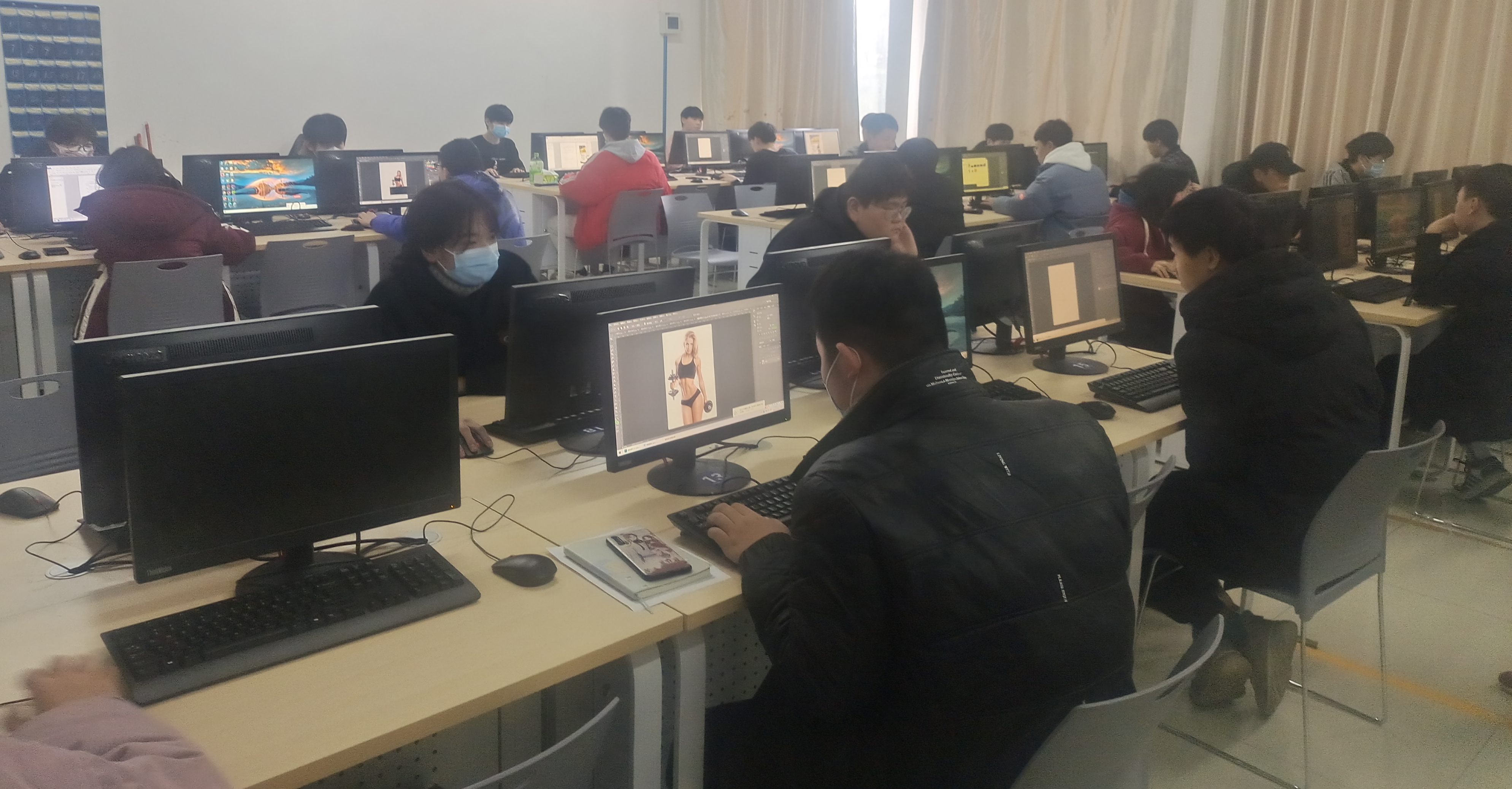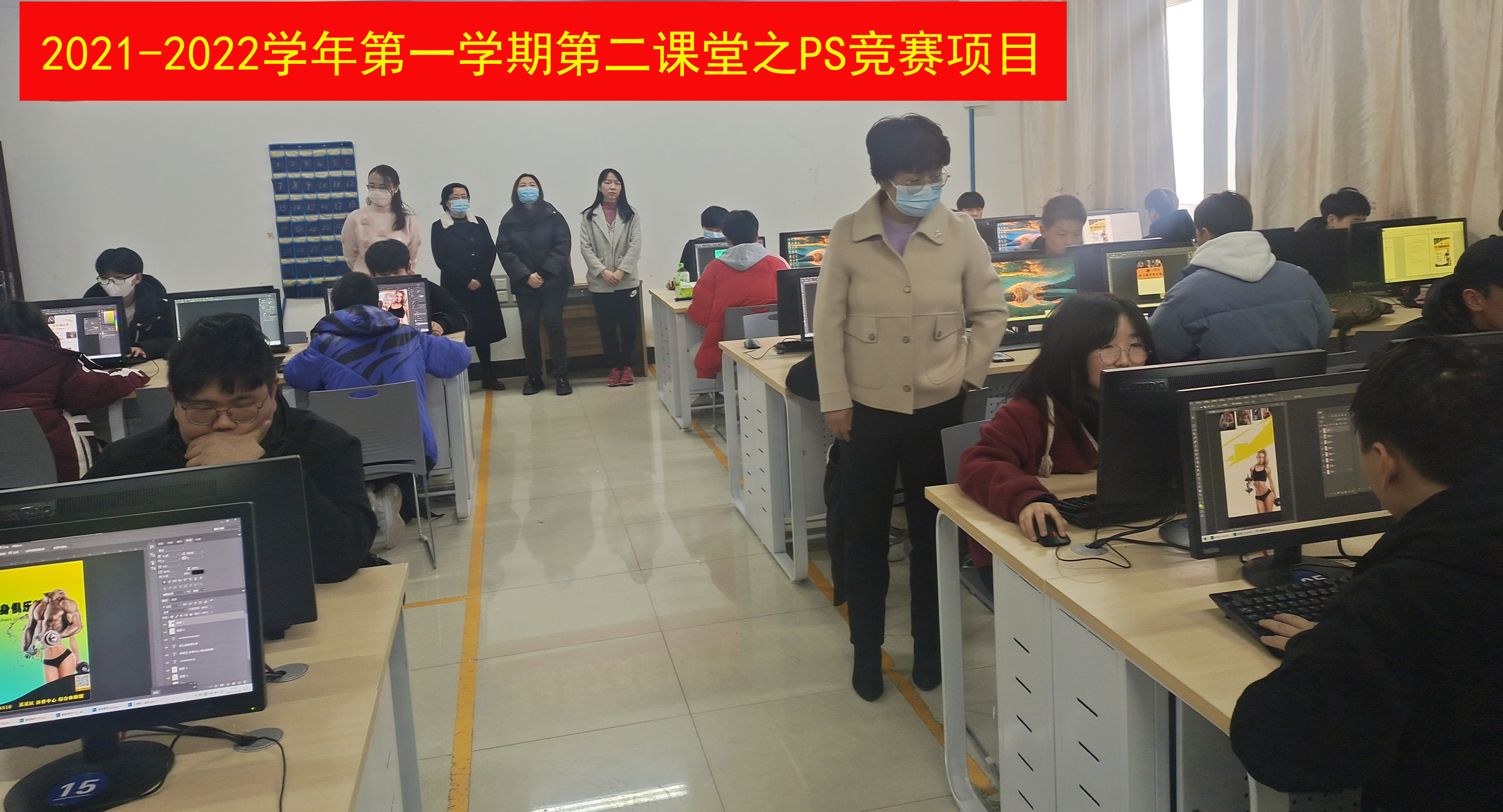 下午14:30,由指导老师为每一位参赛选手发送了竞赛素材及竞赛赛题目,题目要求选手根据提供的图片素材,制作一个健身馆的宣传海报,各参赛选手拿到素材后,仔细审阅题目要求,然后熟练的应用PhotoShop(简称PS)工具软件开始制作。竞赛过程中,各参赛选手操作娴熟,设计思路清晰,设计目标明确,用时一个小时的时间,各参赛选手顺利完成了竞赛项目的题目要求,制作出了一批优秀健身馆的宣传海报,经五位评委老师认真评审,共评出一等奖作品6名,二等奖作品9名,三等奖作品13名。