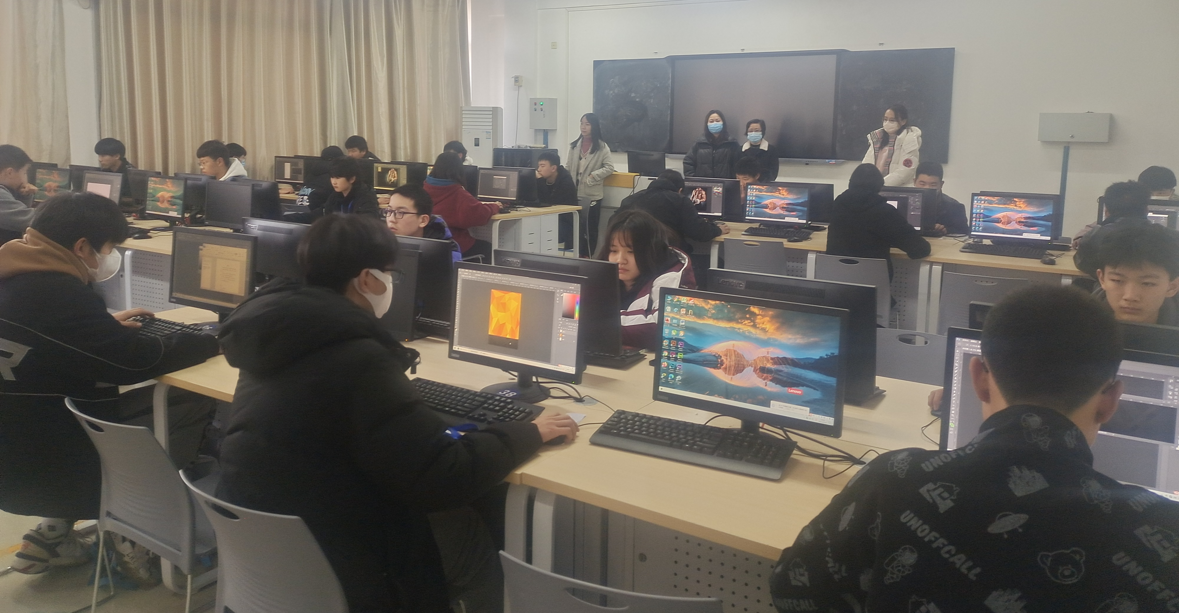 2021年12月14日下午,计算机技术系从计算机网络技术和网络信息安全两个专业中的12个班级中遴选出28名优秀选手参加了2021-2022学年第一学期的第二课堂活动之PS应用技术竞赛项目,此次竞赛活动组织场地在315机房,参加此项第二课堂活动的指导教师及评委有门雅范主任、杨宗仁副主任、石艳老师、尚风琴老师、宋晓丽老师及李楠老师,比赛时间为一个小时。