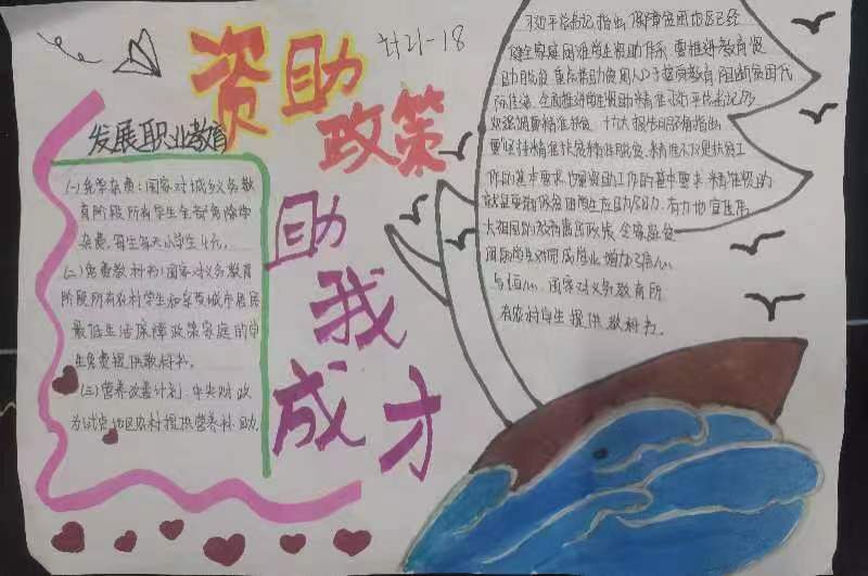 通过这次以班级为单位的宣传活动,加强对家庭经济困难学生资助政策的宣传,确保资助政策家喻户晓,深入人心。手抄报活动的开展,有利于我们引导全体学生深入了解到国家资助政策。激励家庭困难学生克服困难、励志成才、心怀感恩、努力学习,不辜负党和国家的培育之恩.