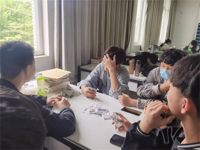 在毛毛虫竞速和同心鼓比赛期间,考虑到场地因素,各班轮流进行。没有上场比赛的班级在各自教室里举办双升扑克牌比赛,大多同学是临时抱佛脚,在班主任的突击培训下,同学们立即“上岗”,经过几把小试身手后,同学们很快掌握了基本的游戏规则,本着“重在参与、互学互助、增进友谊”的原则,参赛选手开始斗智斗勇、各显身手,比赛过程跌宕起伏,精彩纷呈,欢声笑语不绝于耳。经过几轮的角逐,很多同学进入了竞技状态,选手配合默契,对战双方比牌技、比智慧,比成绩,在一旁观战的同学急得抓耳挠腮,摩拳擦掌,不时听到赞叹声、一声声遗憾的叹息。经过两个半天的“双升”比赛,大家放松了心情,也过足了牌瘾。通过比赛切磋了牌技,加强了交流,达到了相互学习、共同提高、愉悦身心、增进友谊的目的。
