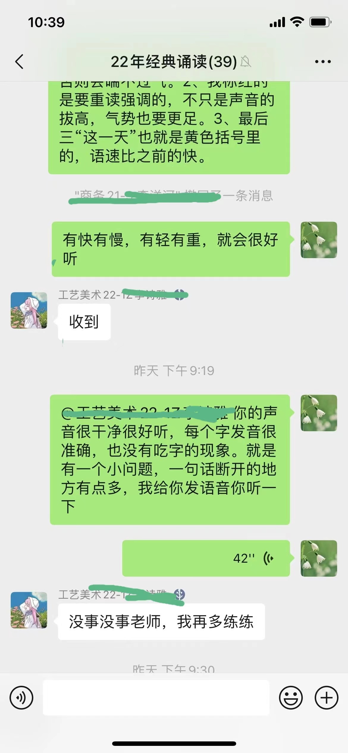 “老师,你听听,看看我还有什么问题?我再重新读。”17日晚9:28分,艺术21-02班孟维健发私信给张瑞瑞老师,请教诵读中的问题,在得到答复后,孟维健说:“老师,我再练几遍,然后再让老师听听。每天晚上这样读一读,感觉心情都变好了很多。”