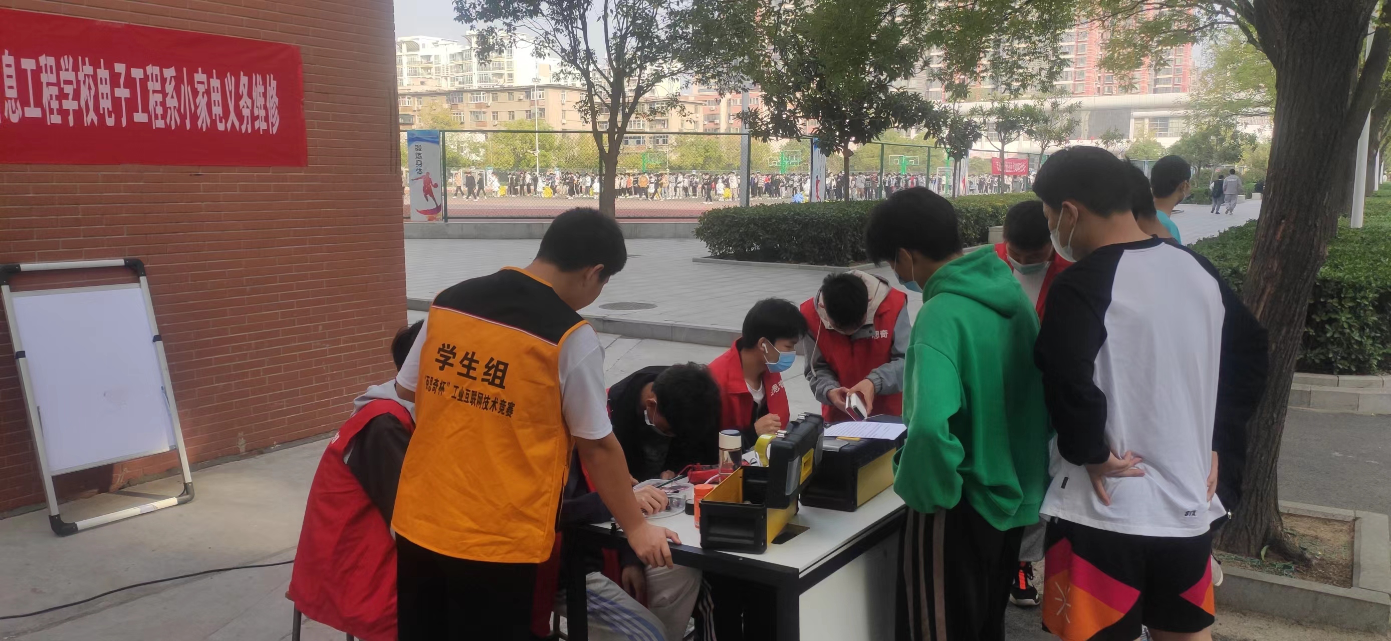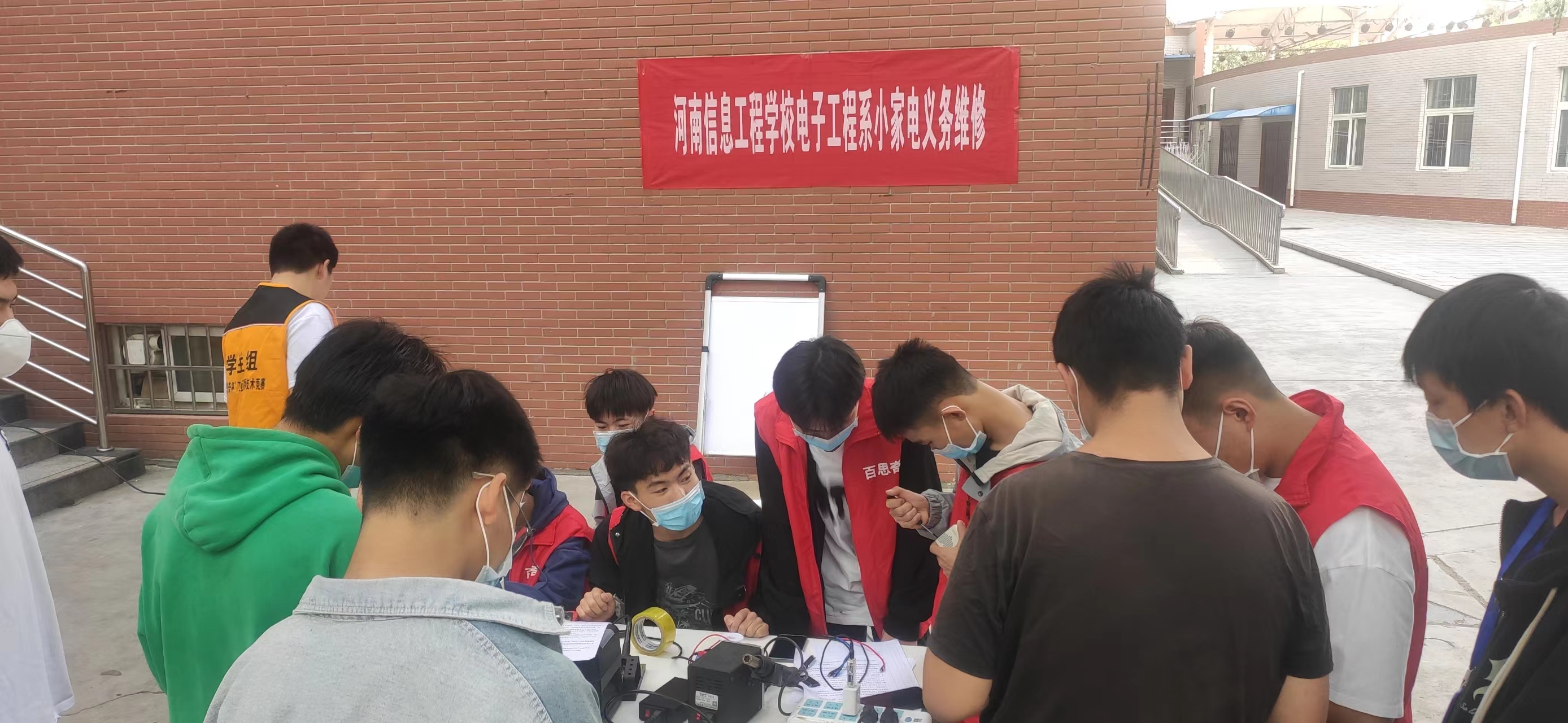 为弘扬志愿精神,充分展示我系专业特色,提高学生的专业动手能力,由我校电子工程系主办,电子协会承办的校园小家电义务维修活动,于2022年10月23日在实训楼东人行道上举行。本次活动面向我校北校区在校全体师生,服务内容主要包括手机、充电宝、数据线等维修,主要解决疫情防控期间在校师生的故障小家电无法送校外维修问题。志愿服务人员由电子工程系老师、电子协会成员组成。整个活动过程严格按我校疫情防控要求,参与师生全程佩戴口罩,所有小家电必须先消毒再维修。