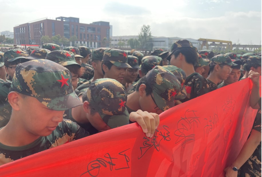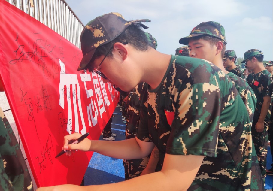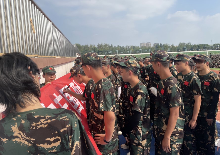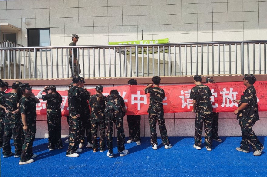 在老师的带领下2023级各班新生代表纷纷在印有“勿忘国耻 振兴中华 请党放心 强国有我”的横幅上郑重地写下了自己的名字。郑安学子继承着先烈的遗志,用我们浓浓的爱国之情向历史证明,请党放心,强国有我。